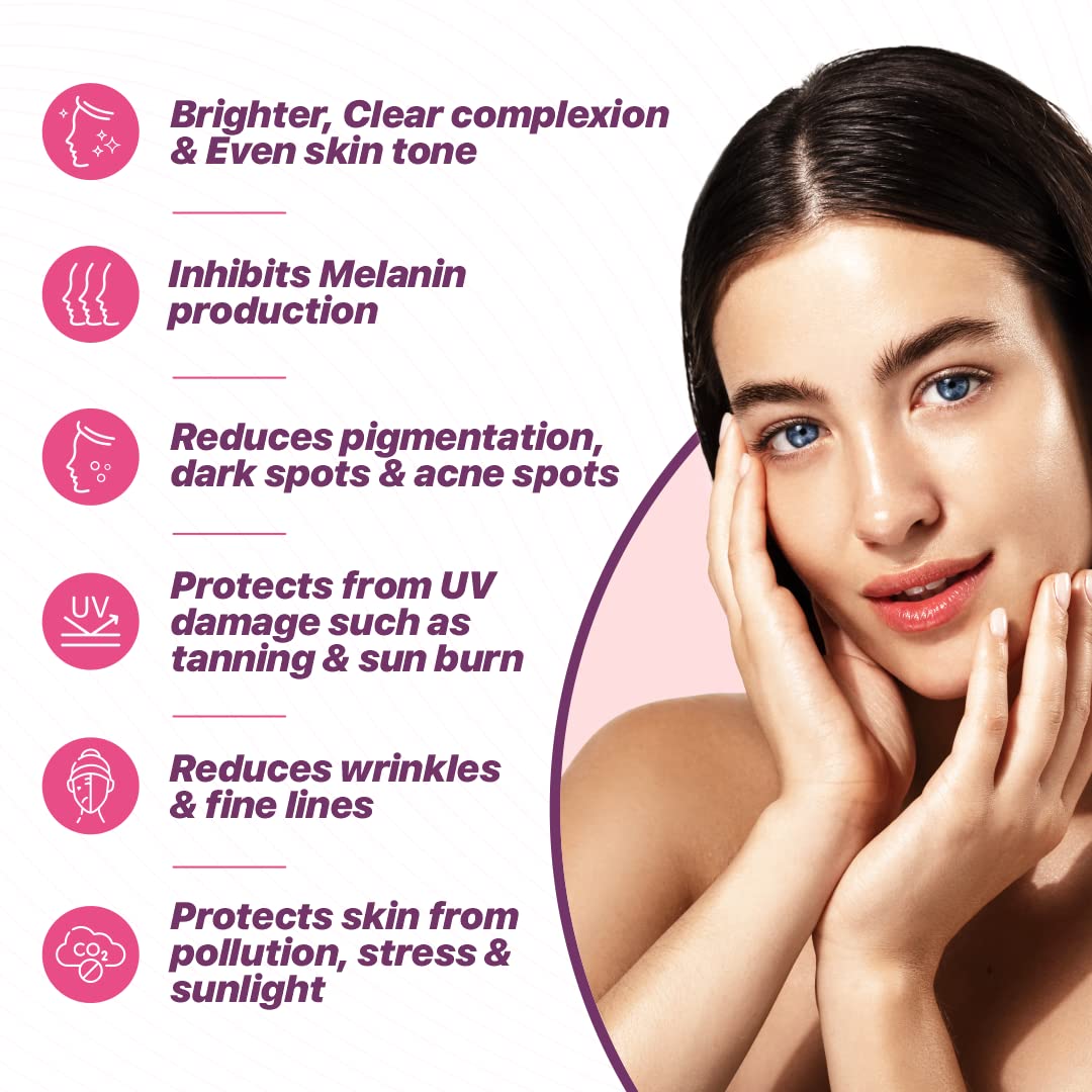 | Product Benefits | Builds collagen and reduces appearance of fine lines, wrinkles, Reduces Melanin and UV damage, Hydrates skin and promotes even complexion from tip to toe, Promotes Bright and Clear Complexion, Reduces Pigmentation and Dark Spots See more |