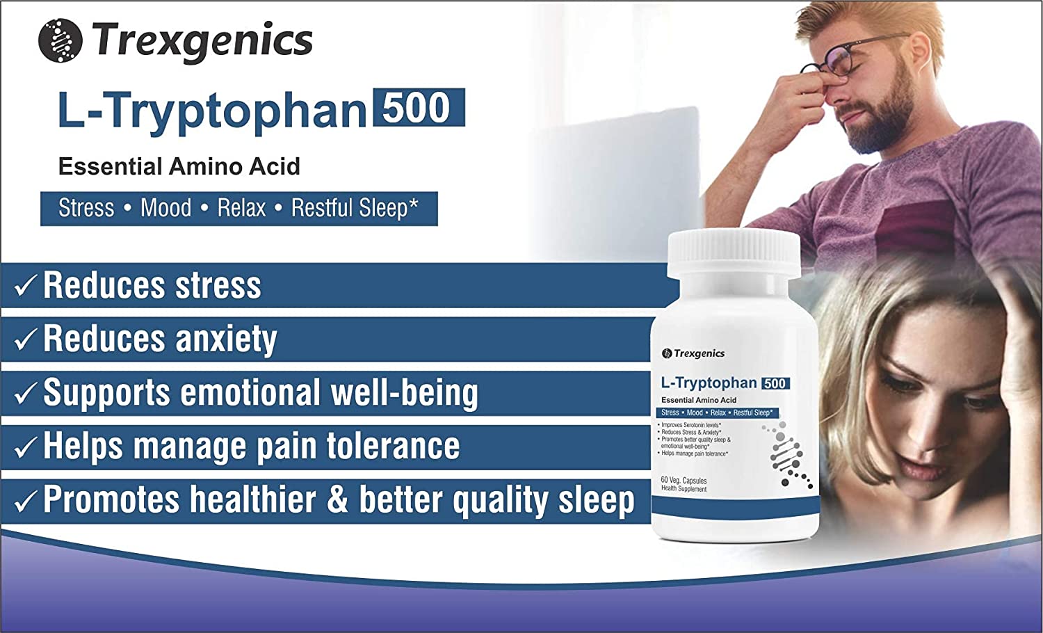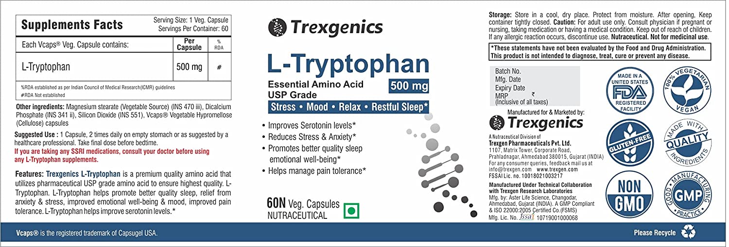• ✓Trexgenics L-TRYPTOPHAN provides premium quality Amino acid that helps to support emotional well being, restful sleep, reduce anxiety and stress.