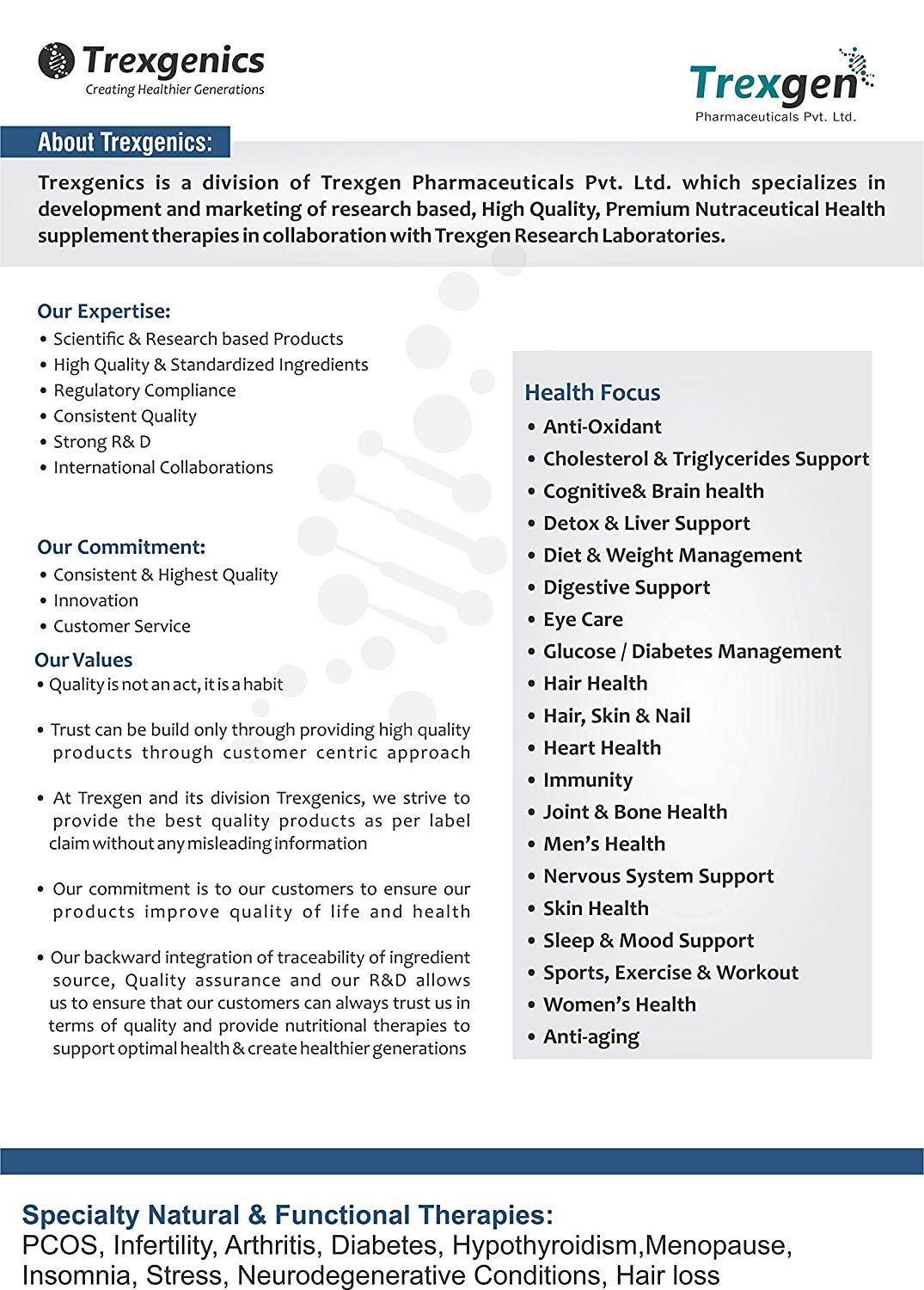 • ✓Trexgenics is a premium scientifically researched ingredients brand that can be trusted for its quality, being a brand of Trexgen Pharmaceuticals Pvt. Ltd. Quality is the cornerstone & Hallmark of our company's policy. Trexgen provides PREMIUM QUALITY Products to support optimal daily health through scientifically researched products with customer satisfaction.