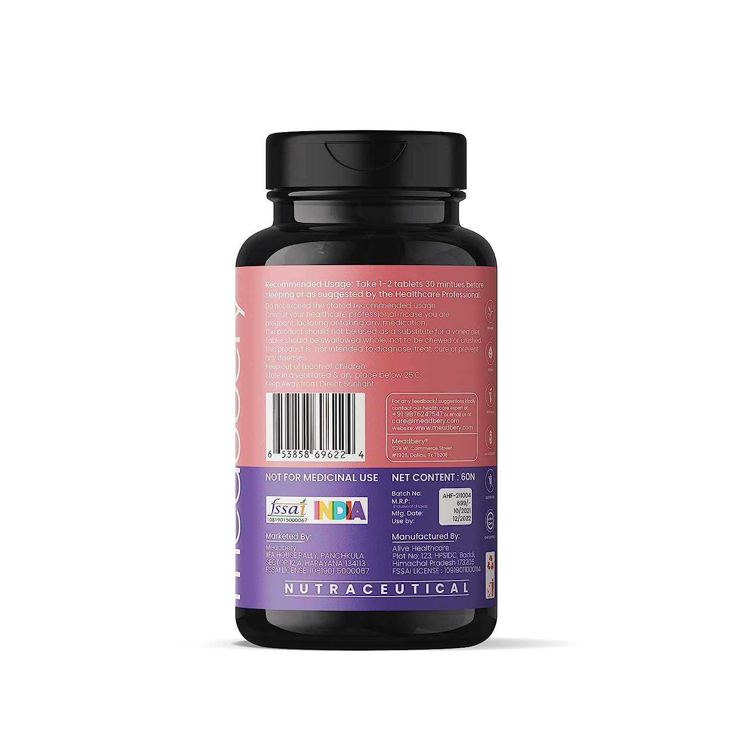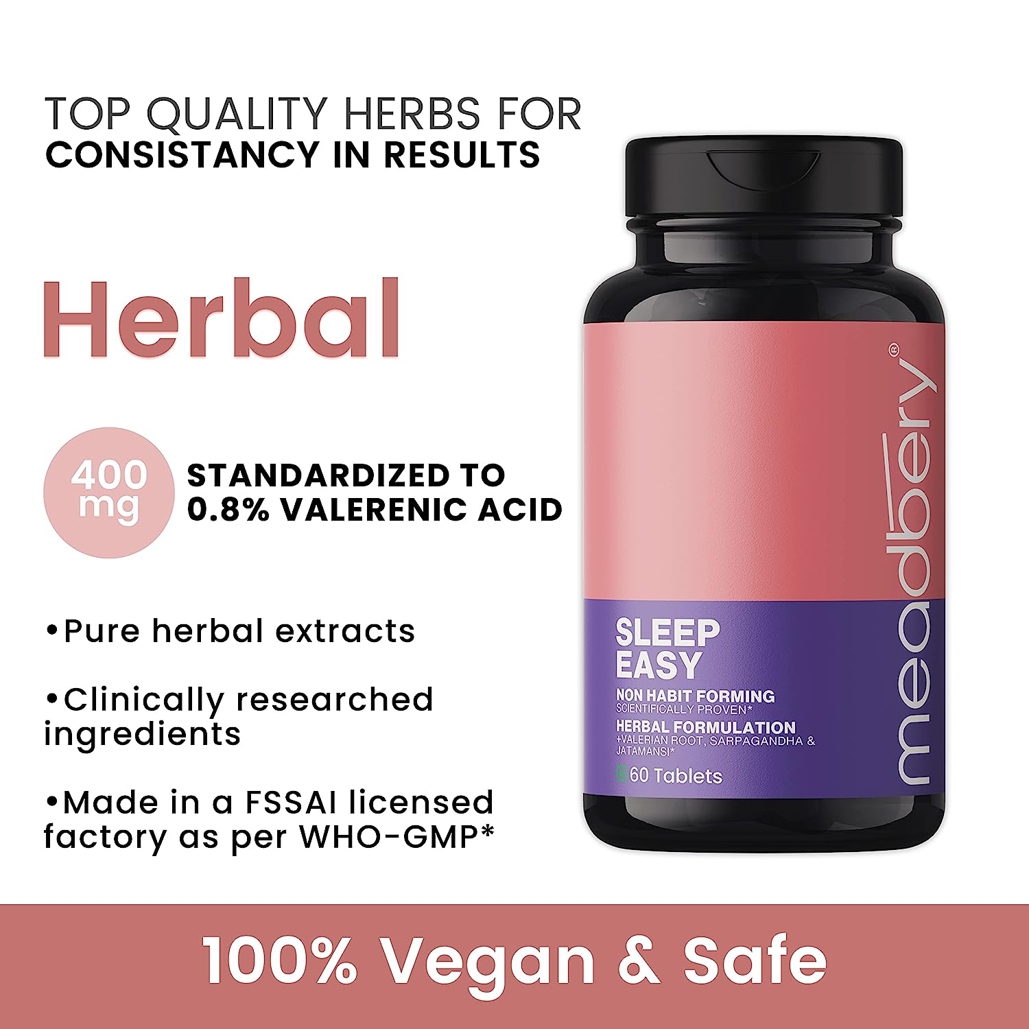 • It is a Triple action synergistic formula for sleep latency, calmness of mind, and tranquil rest. There are varying grades of Valerian/ Tagar in the market - Meadbery Sleep Sure provides valerian root standaridized for .8% Valerenic acid in the accurate dosage for long lasting benefits. All herbs at Meadbery are purchased after HPTLC testing for use of safe, quality herbs which meet international standards of metal toxicity. Our products are HERBAL & VEGETARIAN.