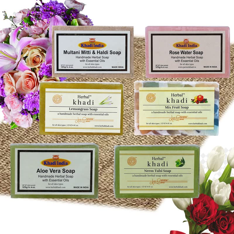 • Six Herbal Khadi Soap: 1. Aloe vera soap, 2. Lemongrass soap, 3. Mix Fruit Soap, 4. Multani mitti soap, 5. Neem Tulsi soap and 6. Rose Water soap.