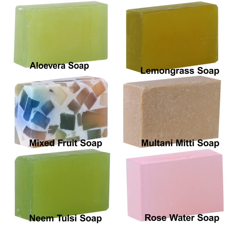 Herbal handmade Aloevera, Neem Tulsi, Lemongrass, Mix fruit, Rose Water, Multani Mitti & Haldi Soap for bath for skin whitening (pack of 6)