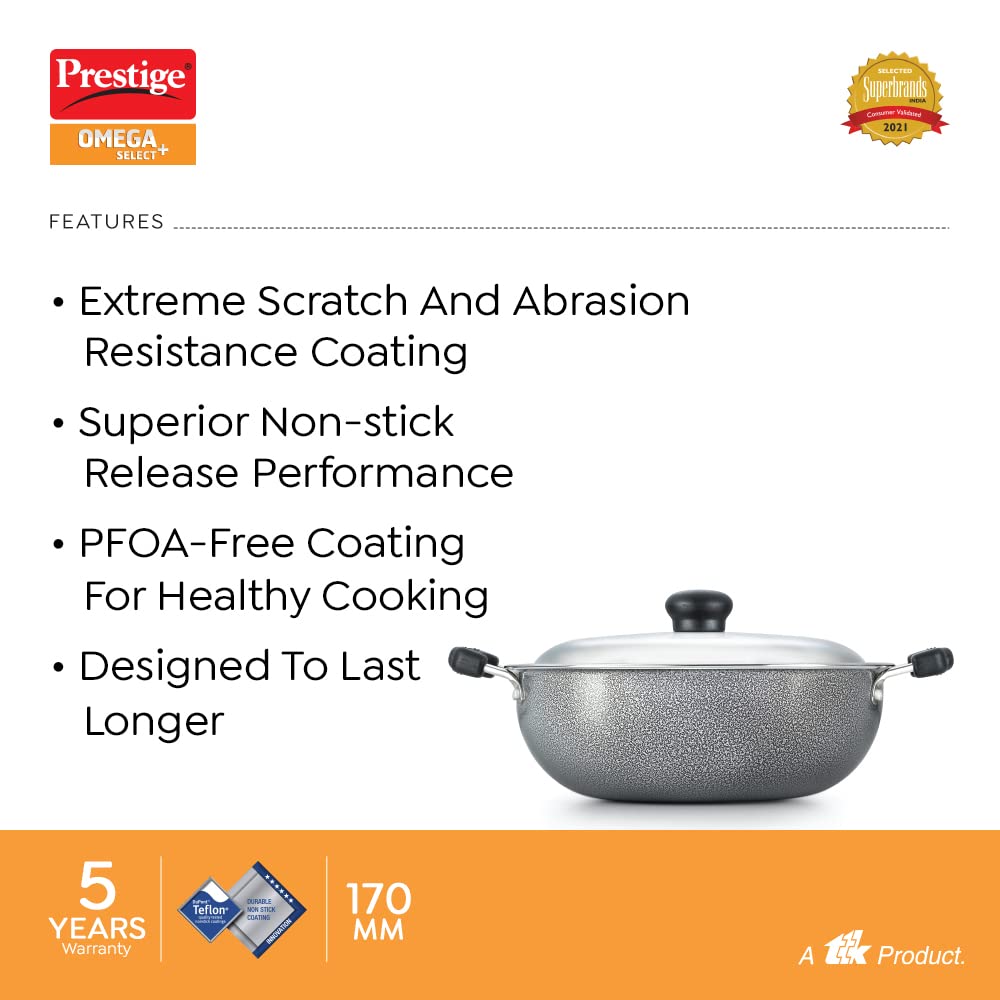 Prestige Aluminium Omega Select Plus Non-Stick Round Base Kadhai with Lid (Grey, 17cm)