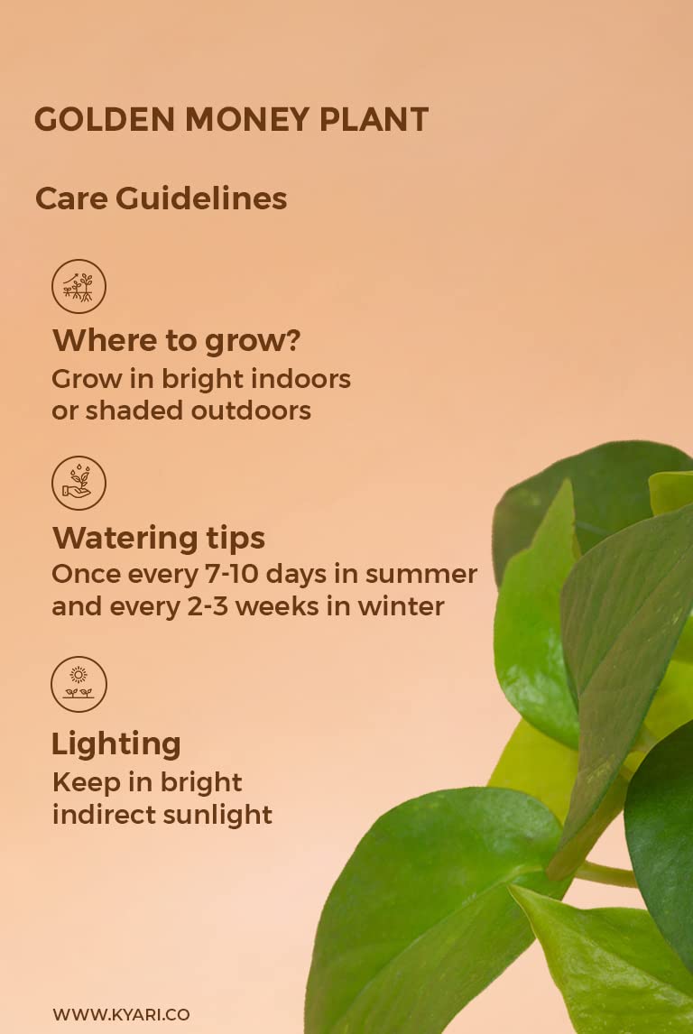 • CARE INSTRUCTIONS: The Money Plant should be placed in areas where it can get indirect sunlight. The watering requirements of this plant change according to the season. In summer, it should be watered every alternate day whereas, in winter, it should be watered only once every 4-5 days. As the money plant grows at a fast pace, it should be repotted every 1-2 years. The best seasons for repotting are considered to be summer and spring.