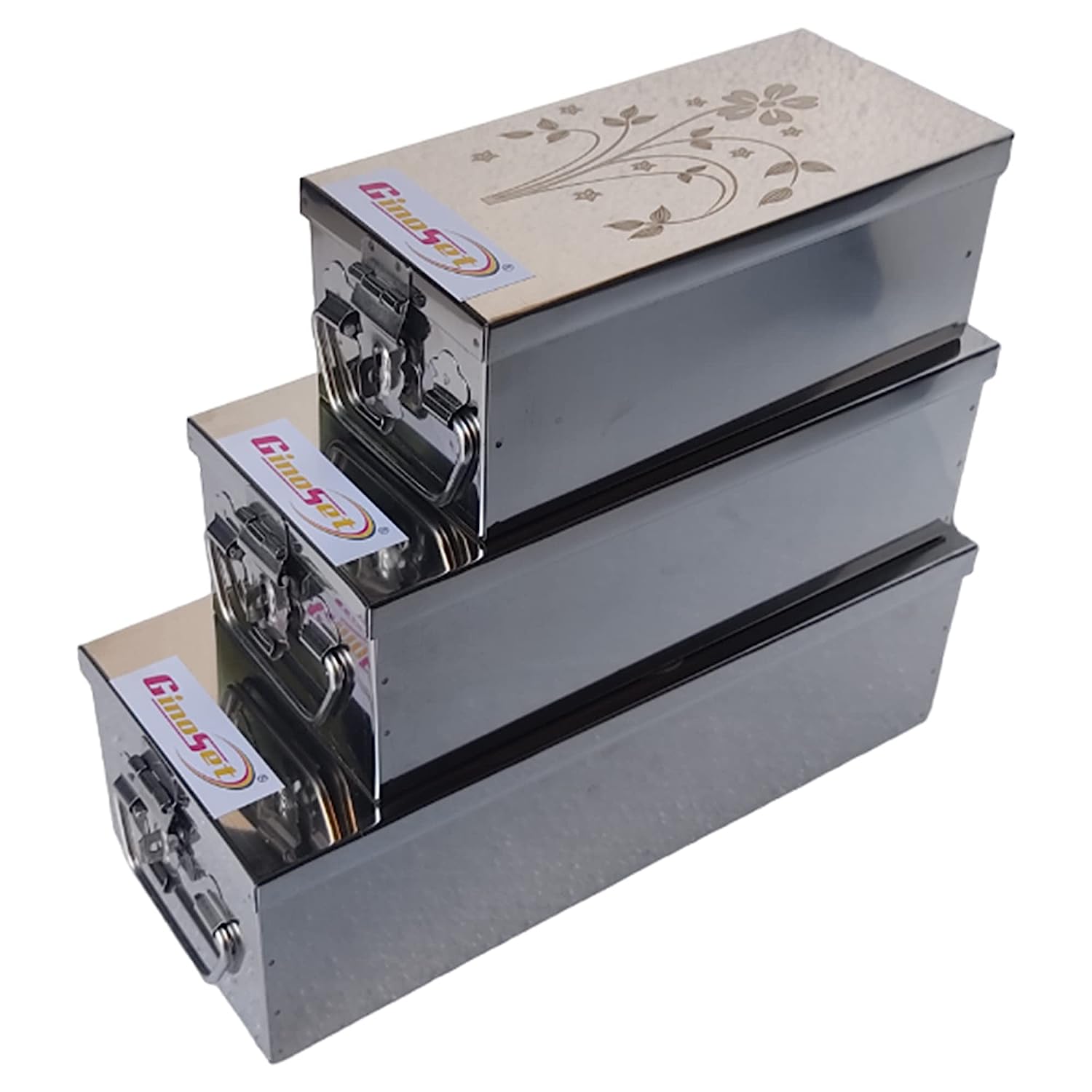 GinoSet® Stainless Steel Locker Boxes Jewellery Boxes Cash Peti Set (Multi_Pack of 3) Size -8 Inch, 10 Inch, 12 Inch. With Laser Printed Design - Silver)