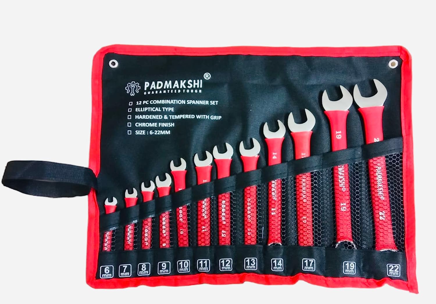 Padmakshi Combination Spanner Wrench Set, Combination Spanner Set 6mm To 22 mm,12-Piece,Chrome Vanadium Steel, with Rolling Pouch,Red Color (With Bag)