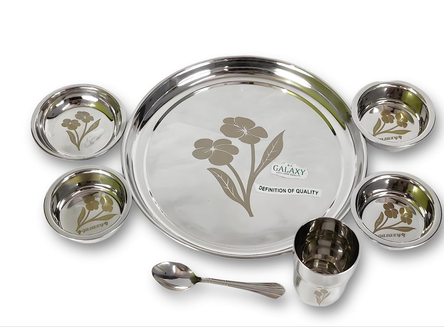 Thali Set Full Steel with Laser Design(Stainless Steel); 7 pcs: 1 Thali, 3 Bowls, 1 Pudding Bowl, 1 Glass, 1 Spoon