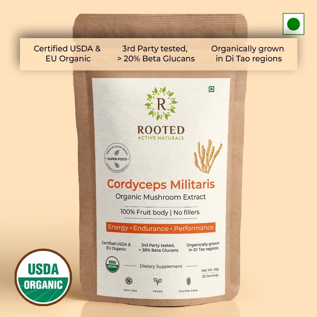 Rooted Actives Cordyceps Mushroom Extract powder (45 g) |Energy, Stamina & Endurance | Supports Testosterone, Virility, Lung health, USDA Organic, 20?ta Glucans