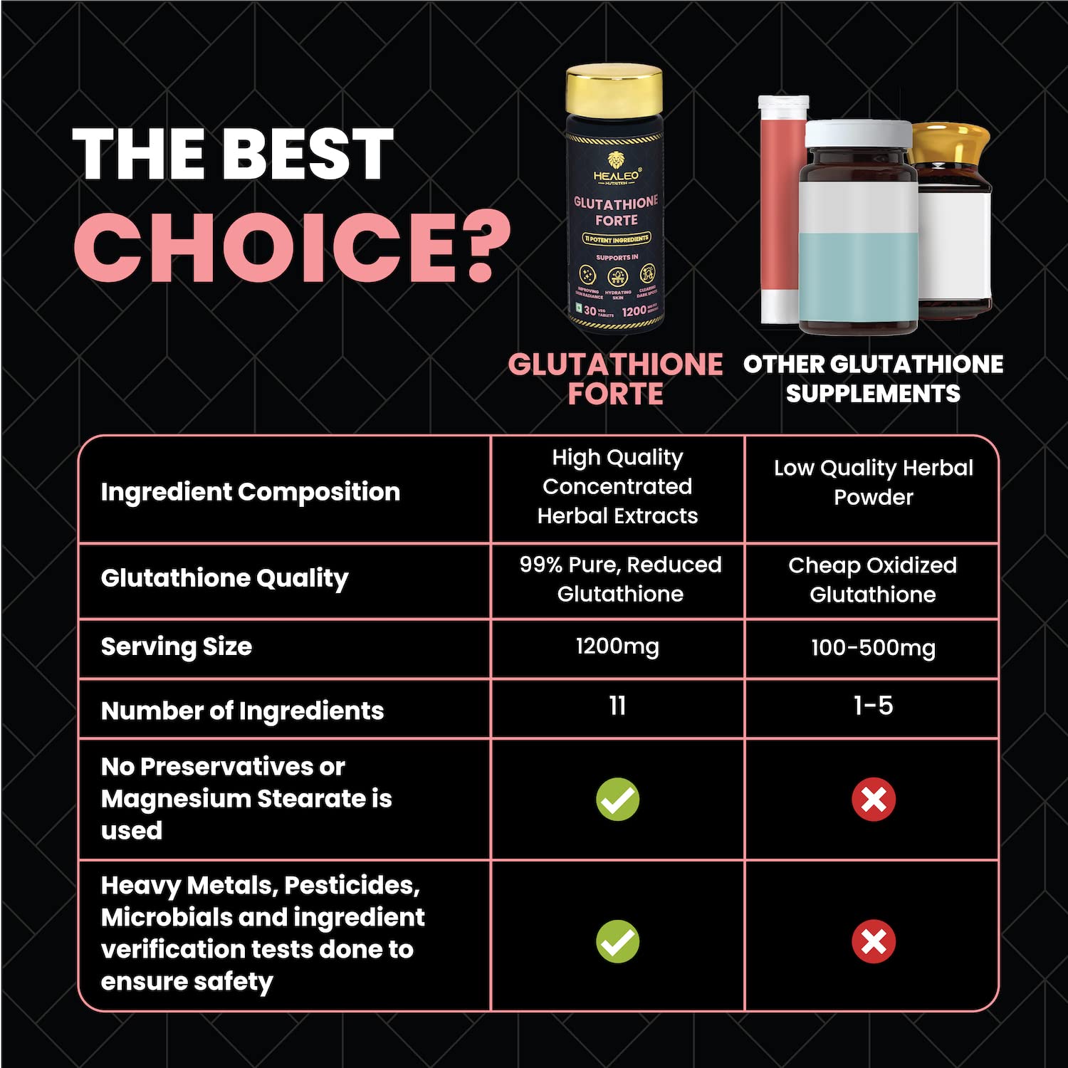 - Highly Purified Form of Glutathione: Healeo Glutathione Forte contains a purity level of 99%. Higher purity means more of the active compounds in each serving that give glutathione its skin brightening properties.