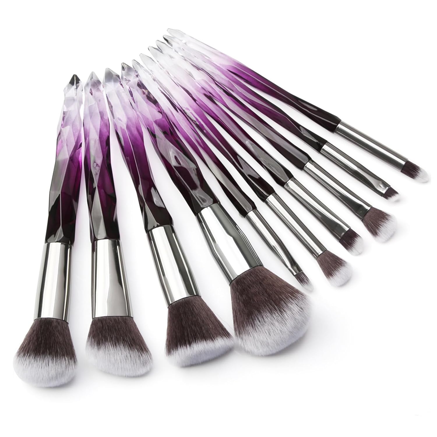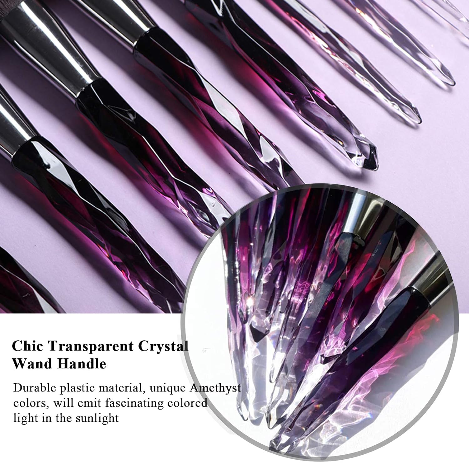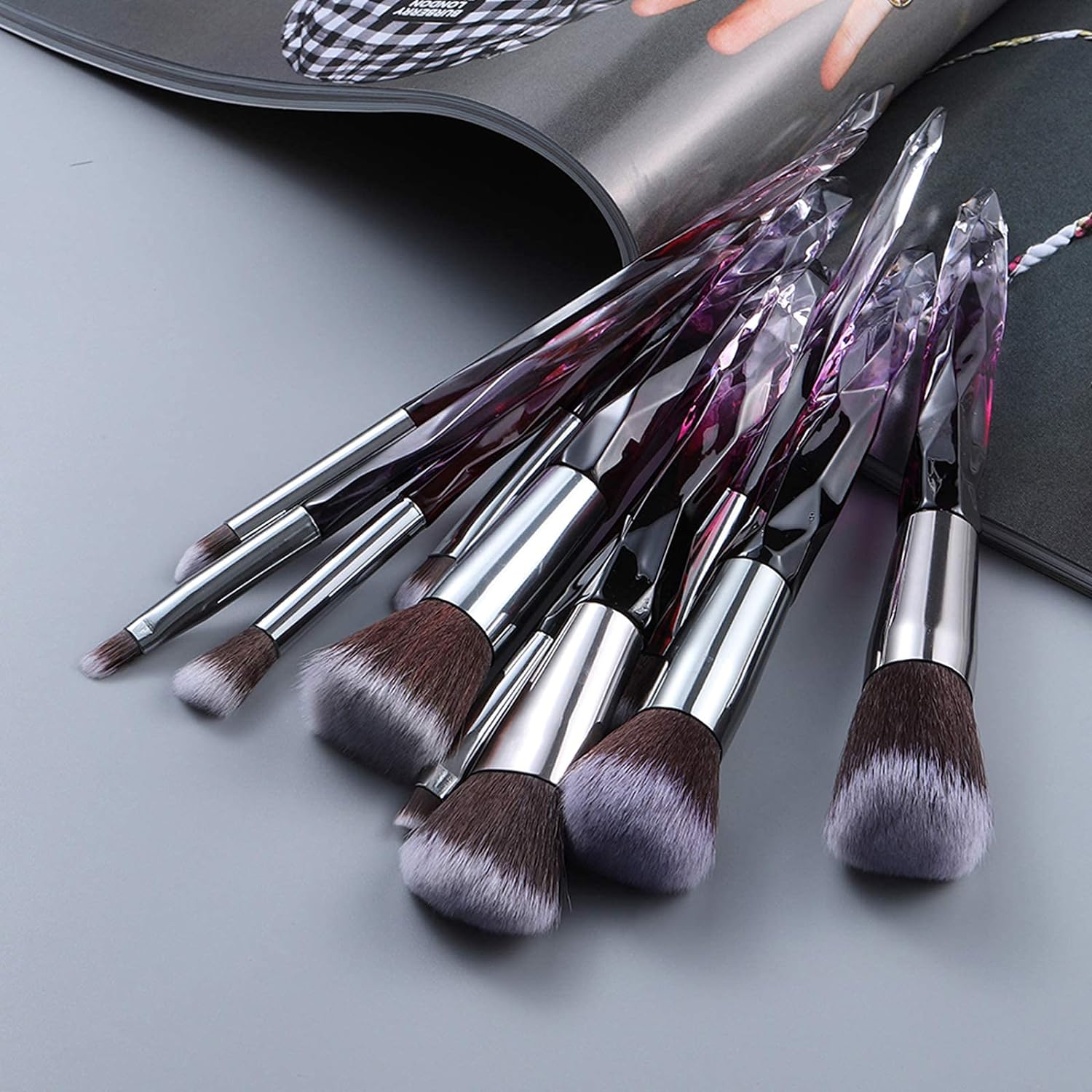 - ???? Popular Crystal Style Makeup Brush Set - This crystal style makeup brush set will be the best gift choice for you. The irregular surface of its transparent handle will emit fascinating purple-colored light in the light or sunlight.