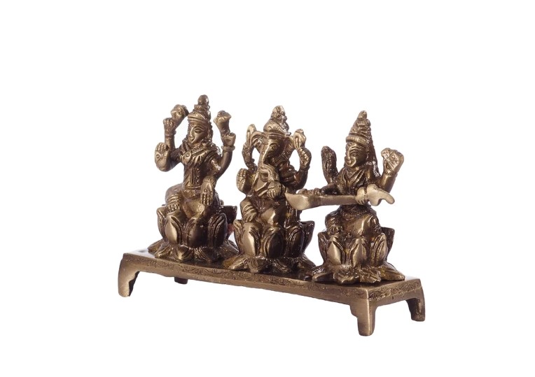 Product Description - Decorate your home with our Brown Brass Laxmi Ganesha Saraswati on a lotus base that is literal proof of craftsmanship. This brass showpiece reflects elegance and is also a great gift option for your friends and especially your family when it comes to religious festivities or celebrations. Idols & figurines are said to bring prosperity to the lives of people who have a hold of them in their homes. Intricately designed, these are a perfect handcrafted showpiece that is made using several inherited techniques. Exquisitely designed and intricately crafted, it makes for a perfect gifting option. This showpiece is handcrafted intricately by our skilled artisans. You can find many more god idols and figurines in different avatars on our online portal in various colors that suit your home or office interior.