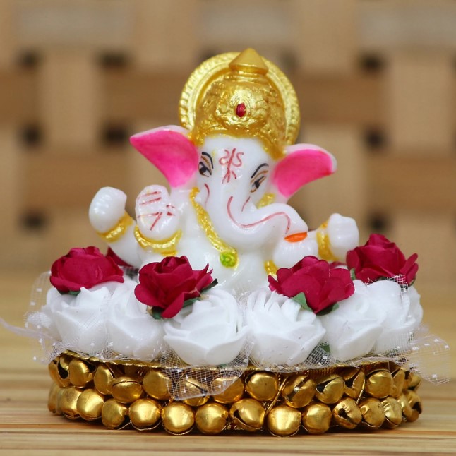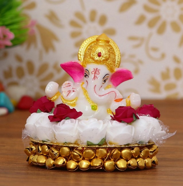 Product Description - Grace your Car Dashboard, office desk, Home Temple, children's desk, and computer table with the divine beauty of Lord Ganesha. Endowed with child-like innocence, mischief in their eyes, and carefree disposition, Lord Ganesha is dear to his devotees and is pleasant to look upon. Exquisitely designed and intricately crafted, golden, yellow, red & white Lord Ganesha with decorative flowers plate makes for a perfect gifting option for Relatives, Friends, and Colleagues. Ganesha Idols are handcrafted by our skilled artisans giving them an eye-catching look. Each idol reflects the artistic qualities and time one has taken to shape the appreciative decor. Ganesha Idols are handcrafted by our skilled artisans giving them an eye-catching look. Each idol reflects the artistic qualities and time one has taken to shape the appreciative decor. Each idol & figurine at reflects the artistic qualities of the artisan that has made it using inherited methods.