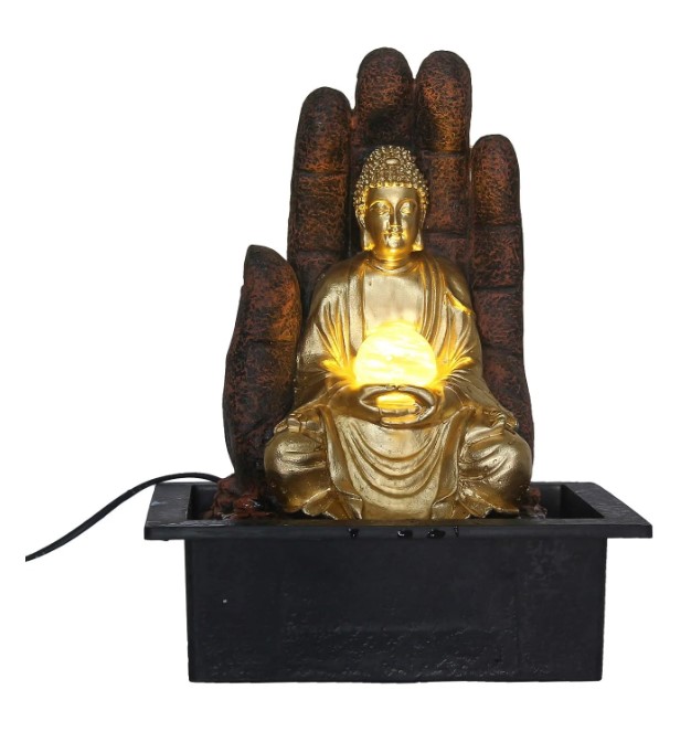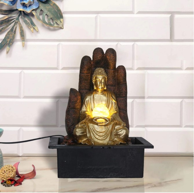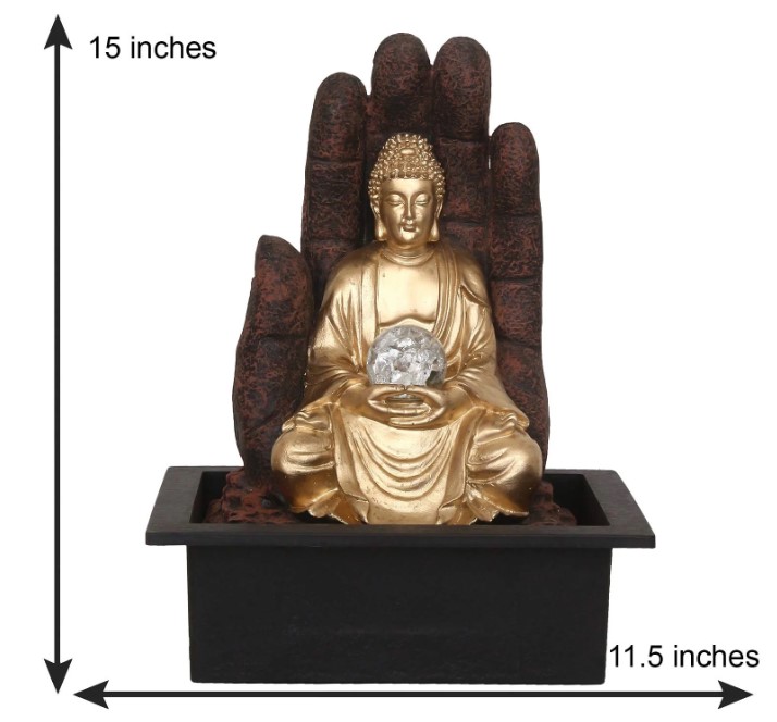 Package Content - One Beautiful Golden Maditation Buddah Water Fountain Show Piece With Led Lights Crystal Ball For Home & Office Decor 15*11.5 Inches
