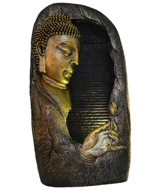 Product Description - So you want a fountain for your home or office or even your meditation/yoga space– you want something pretty, elegant, and attracts just the right amount of attention and positivity. Our Golden polystone premium decorative Buddha water fountain is just what you will want– while the Buddha’s face gives this décor piece the serenity that you might be looking for, the gentle sound of the trickling water will provide you a sense of calm. The design of the fountain is such that it looks like the interior of a cave– Lord Buddha’s face looks longingly at his hand which tries to capture the water that trickles from the top. The lighting adds to the charm as well as a certain level of glamour to the fountain, making this a perfect gifting choice as well! Each water fountain is handcrafted using various ancient techniques by the artisans at the house of and these water fountains are also a great gifting option for your loved ones. Our water fountains have been diligently handcrafted by proficient artisans of who are on a mission to take Indian Art and Culture into each home of India.