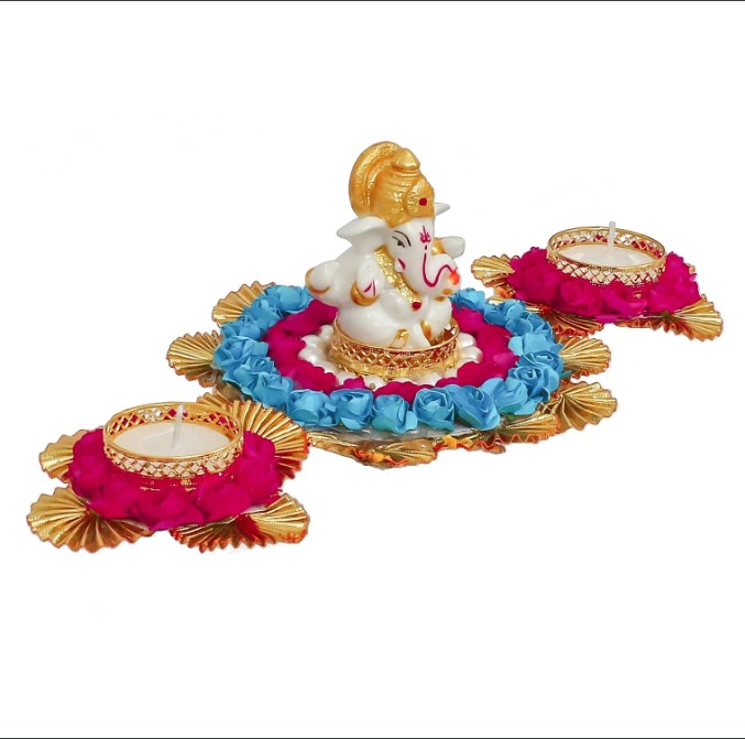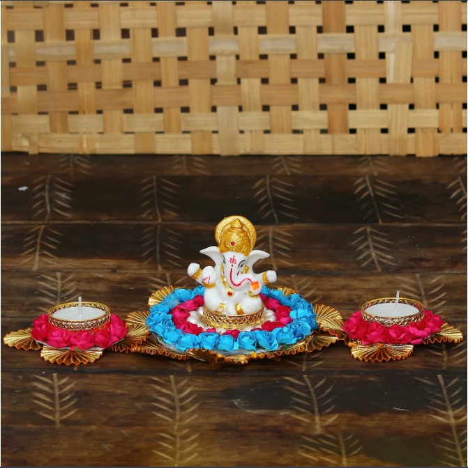 Package Content - One Lord Ganesha Idol on Decorative Plate with 2 Tea Light Holders