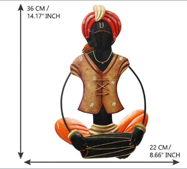 Product Description - A musician playing an instrument, all made using iron, dressed in the brightest of colors– that is what you get when you order our tribal men playing dholak iron musical instruments. Handcrafted using iron, these décor items are created to last and look pretty at the same time– the set comes as individual pieces, which means that you can choose how and where you want to hang them. The colors used to paint the tribal musicians are bright and remind you of the colors of India. This is a great gift for someone who is moving into a new home or for you if you want to add a pop of color to your interiors.