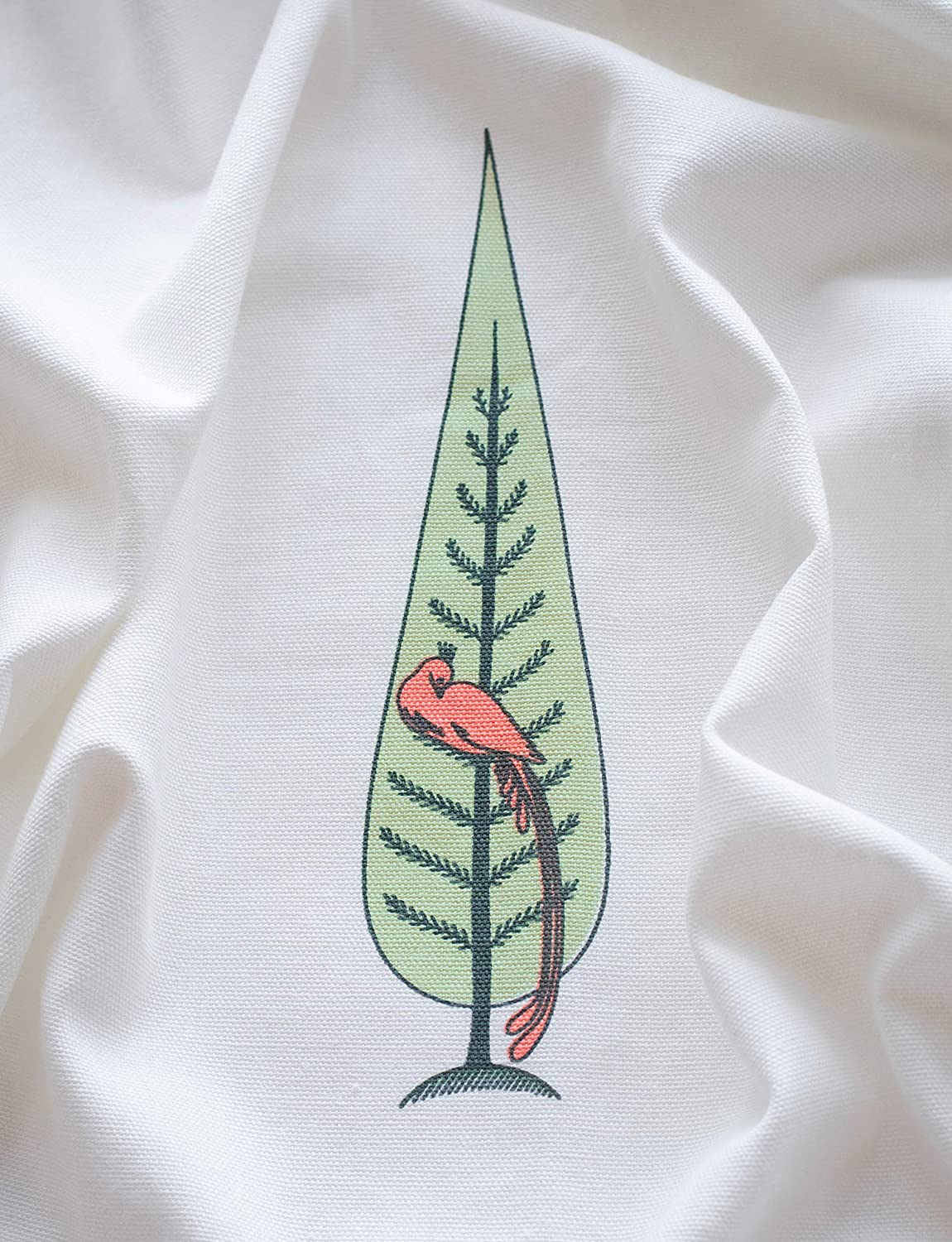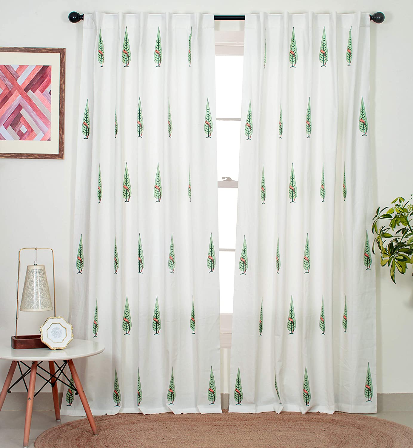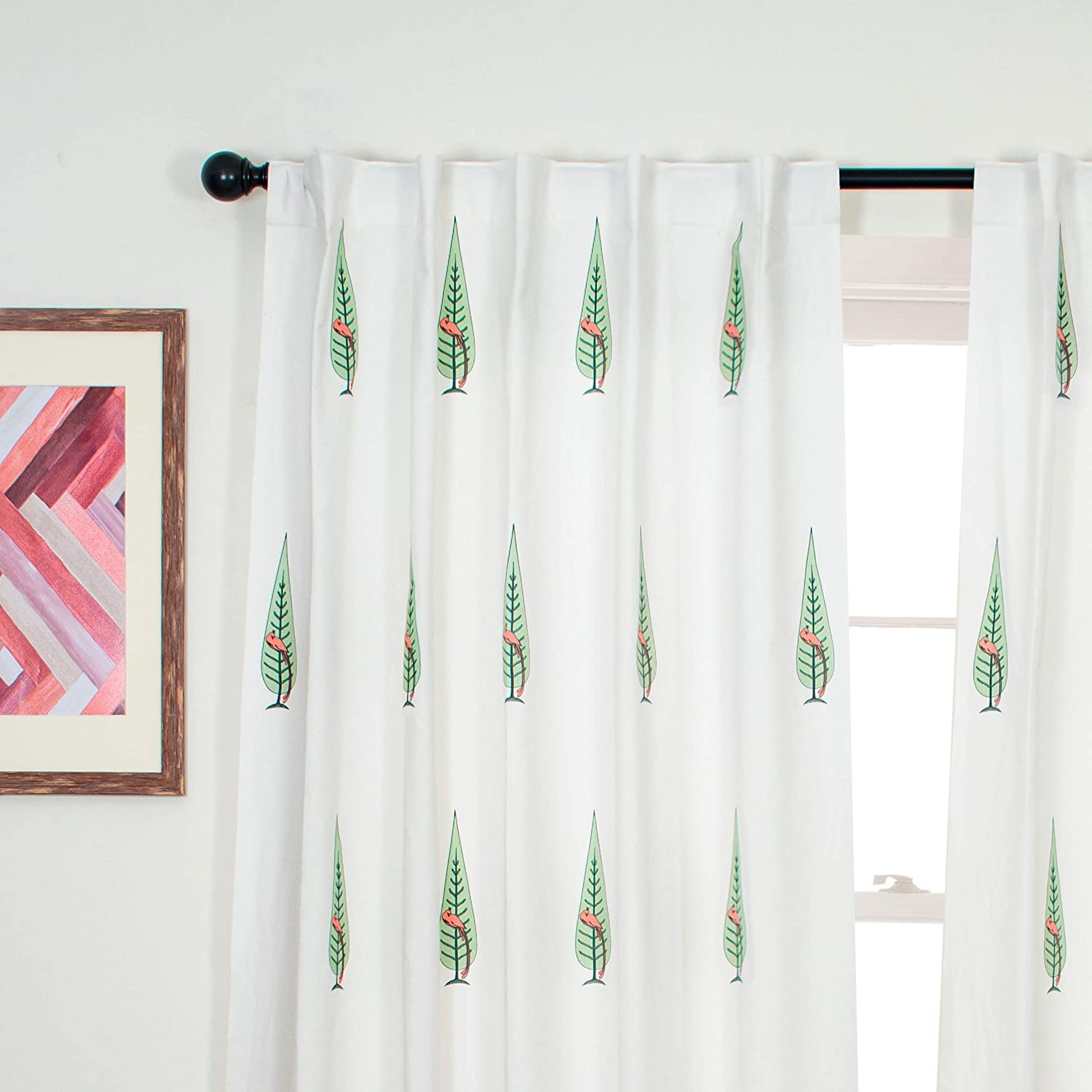 Cotton Bird Window Curtains (Pink, Coral And Light Green, 5 Feet) - Set Of 2(Room Darkening;Back Tab;Washable)