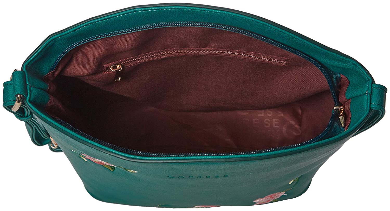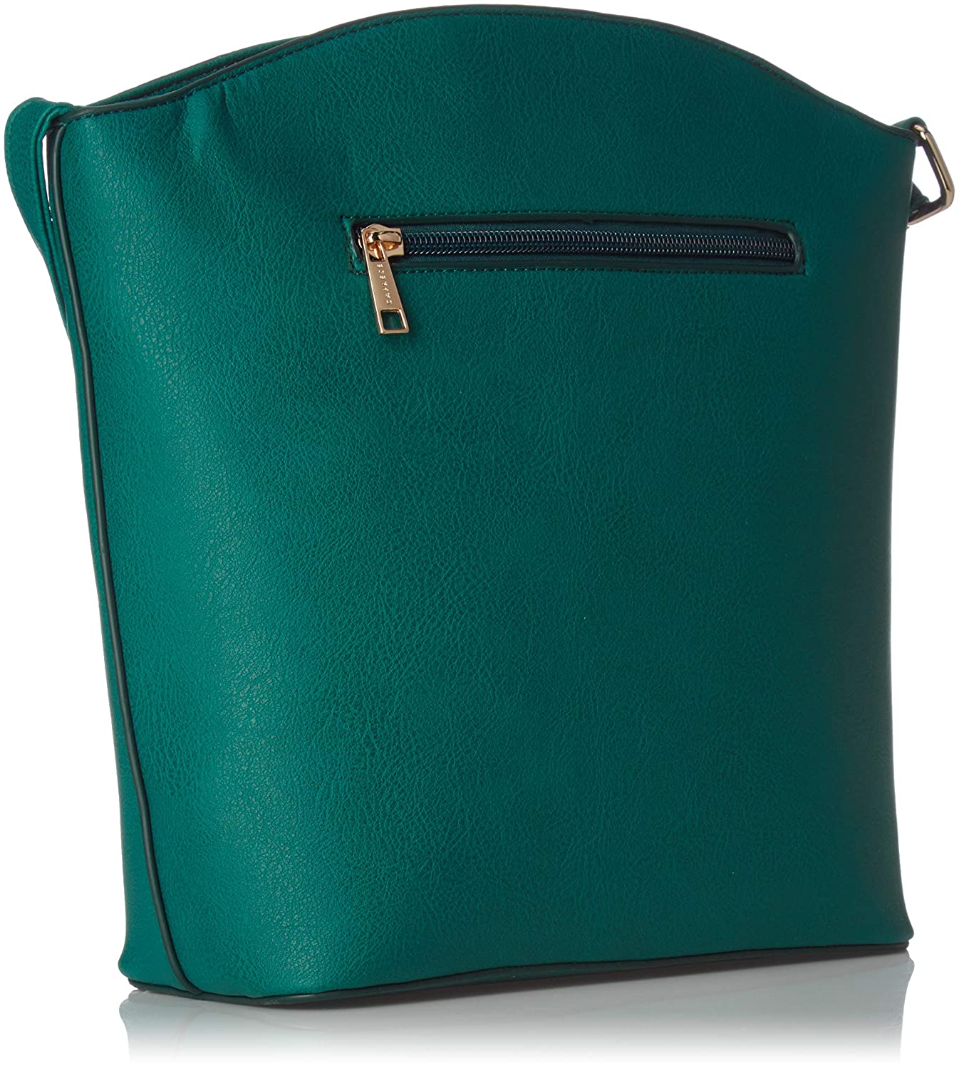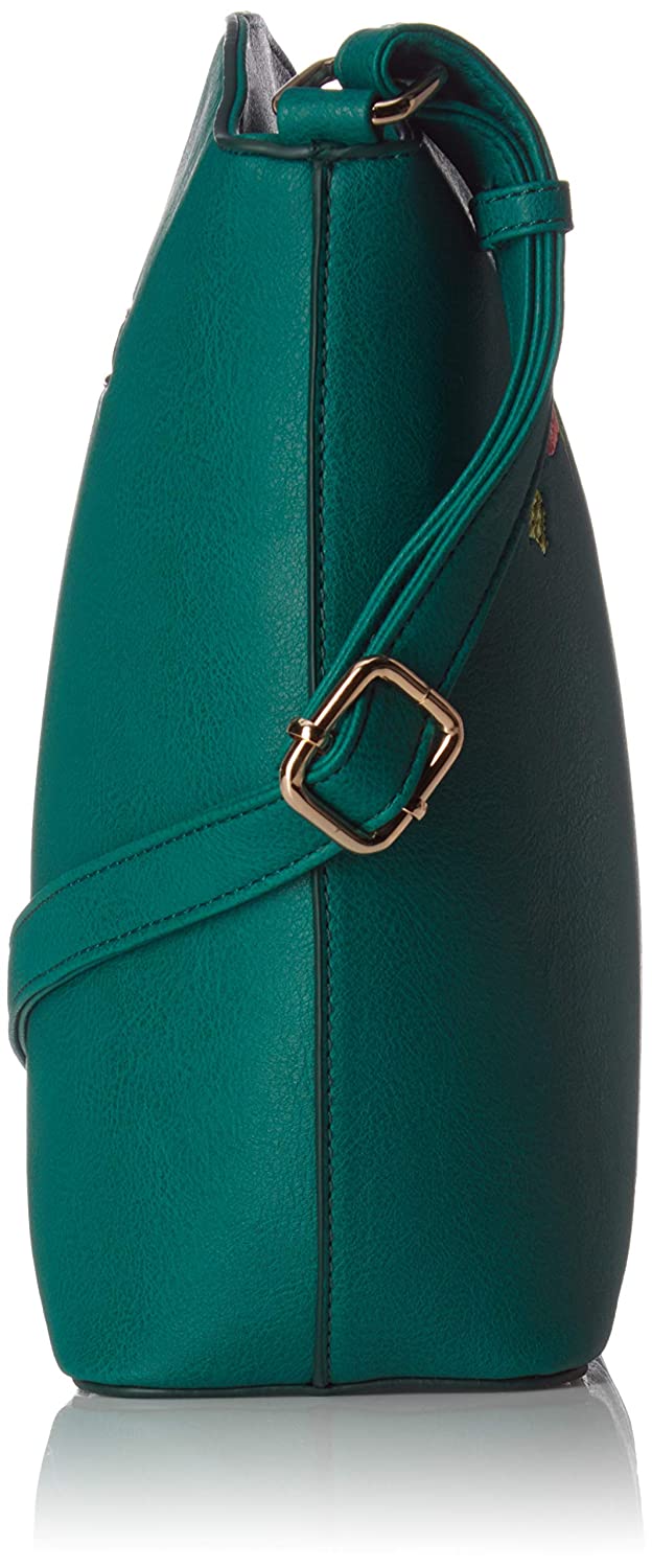 • Faux leather material teal colored sling bag255 centimeters height x 27 centimeters length x 9 centimeters widthDo not expose to extreme heatFlat sling handlesEmbossed logo; multiple compartments