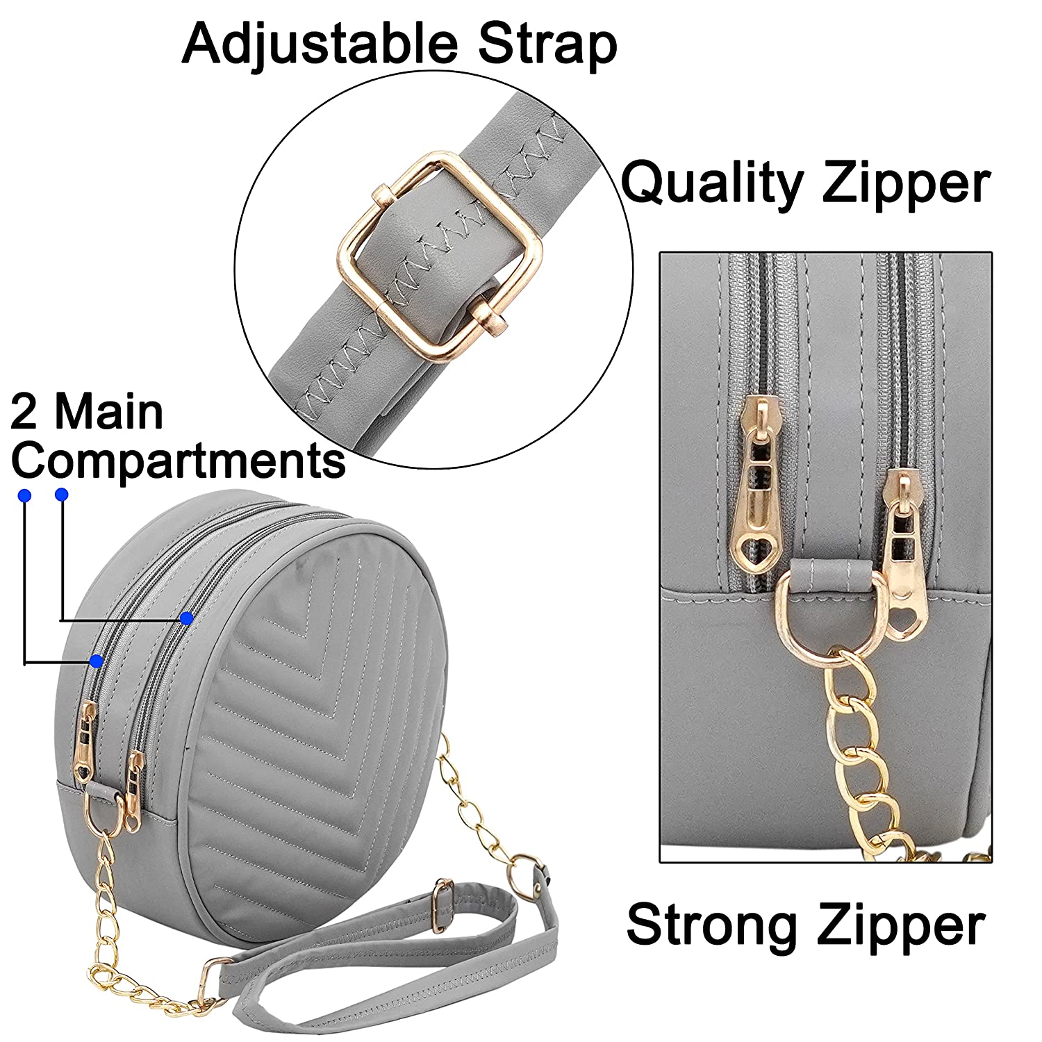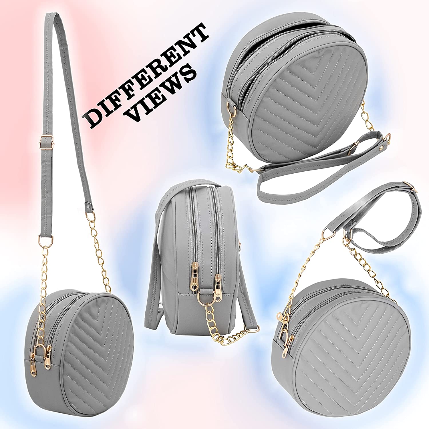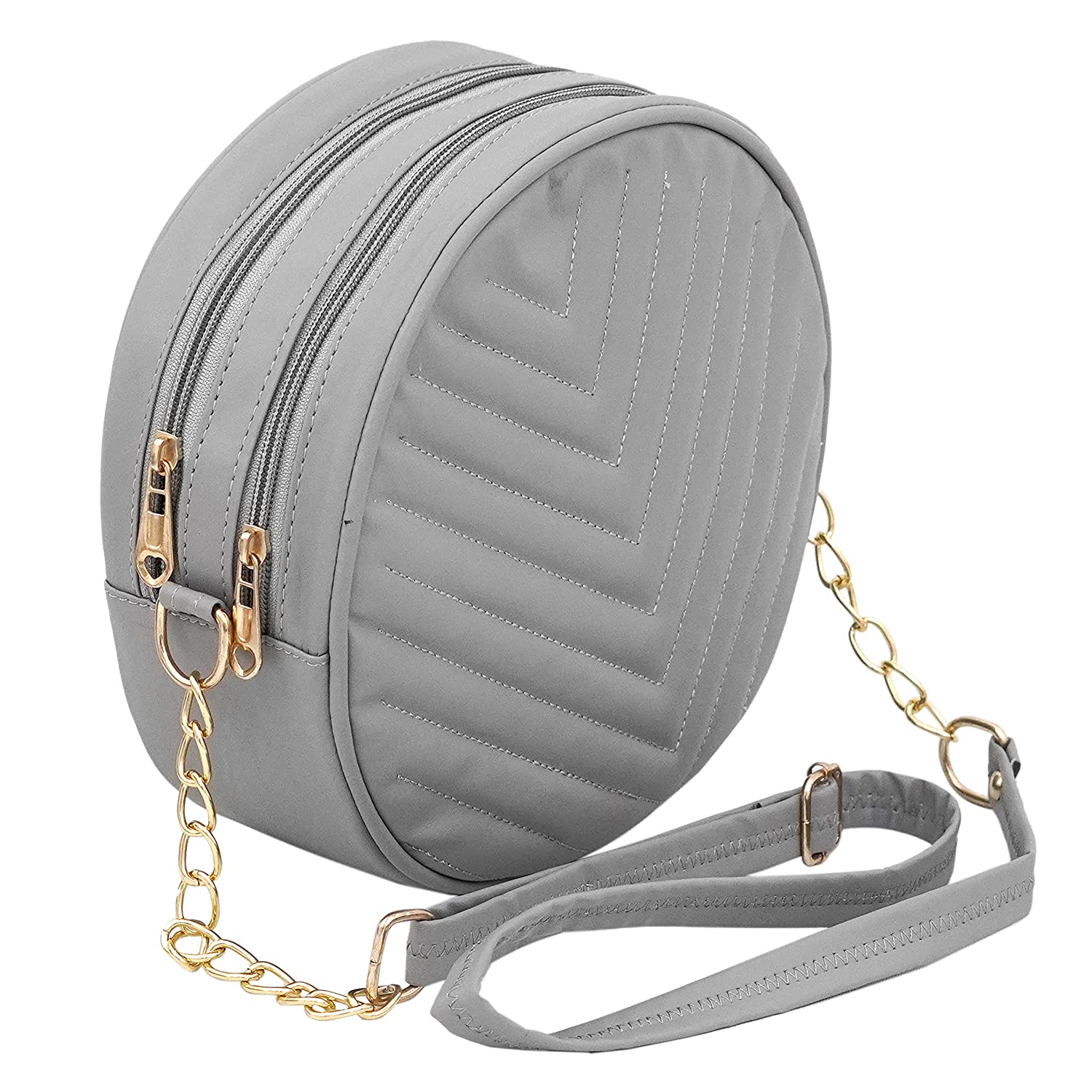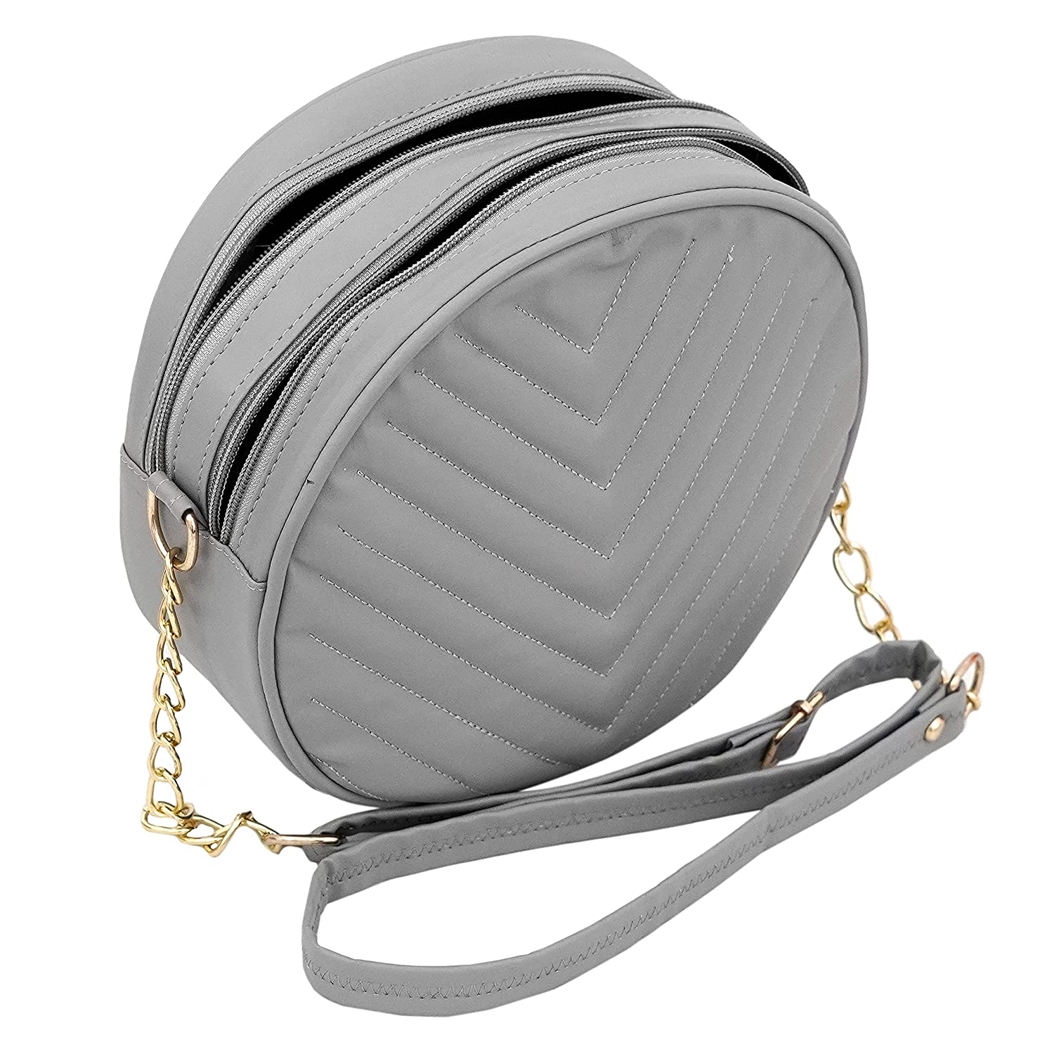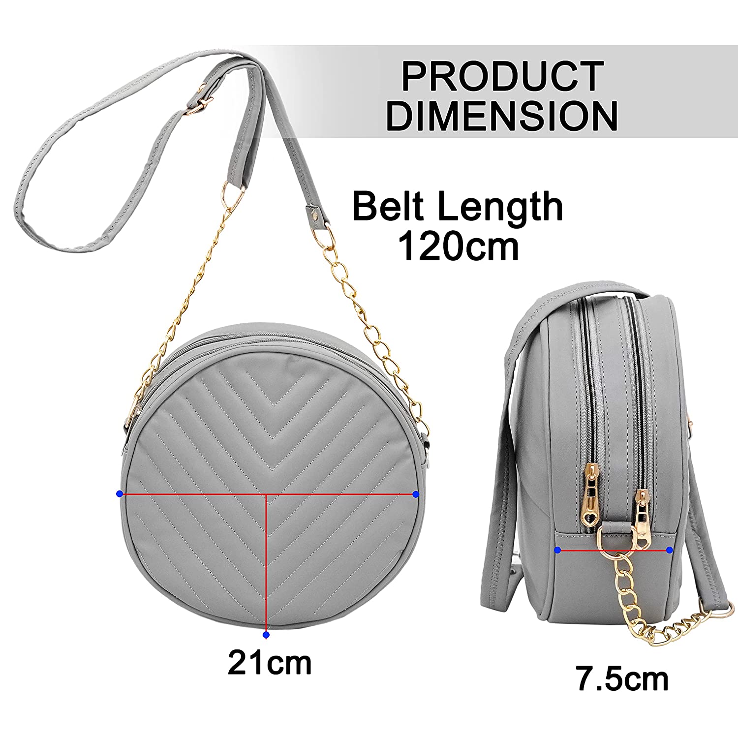 - Stylish round shaped sling bag made with high quality PU with quilting on the front. The sling belt is a combination of PU and Gold Chain. Inside, it has 1 main spacious compartment