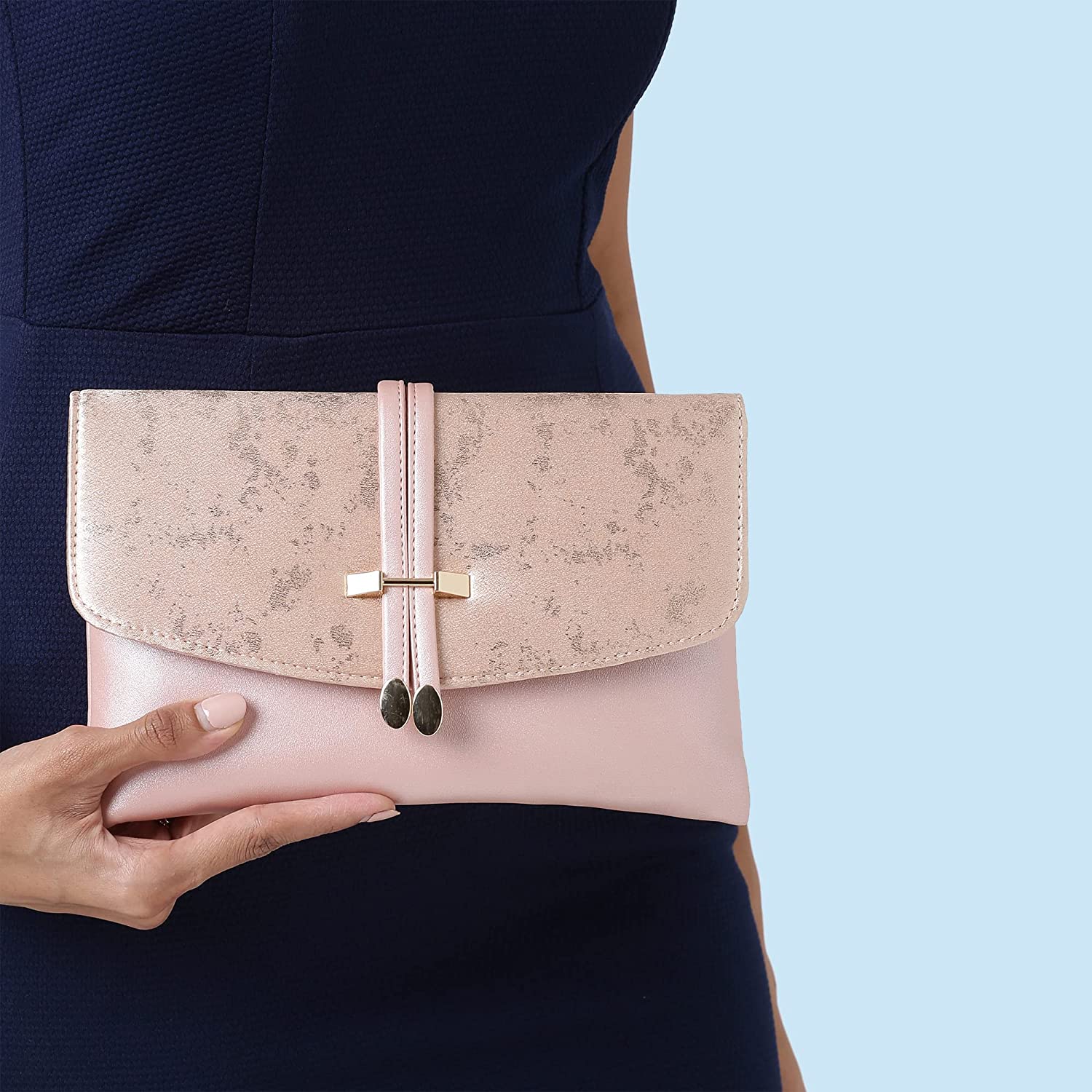 • This stylish envelope clutch by Lavie clutch is made with high end shiny fabric and metal embelishment. It has a flap which can be closed with a durable magnet and two zippered pocket to keep your valuable items safe