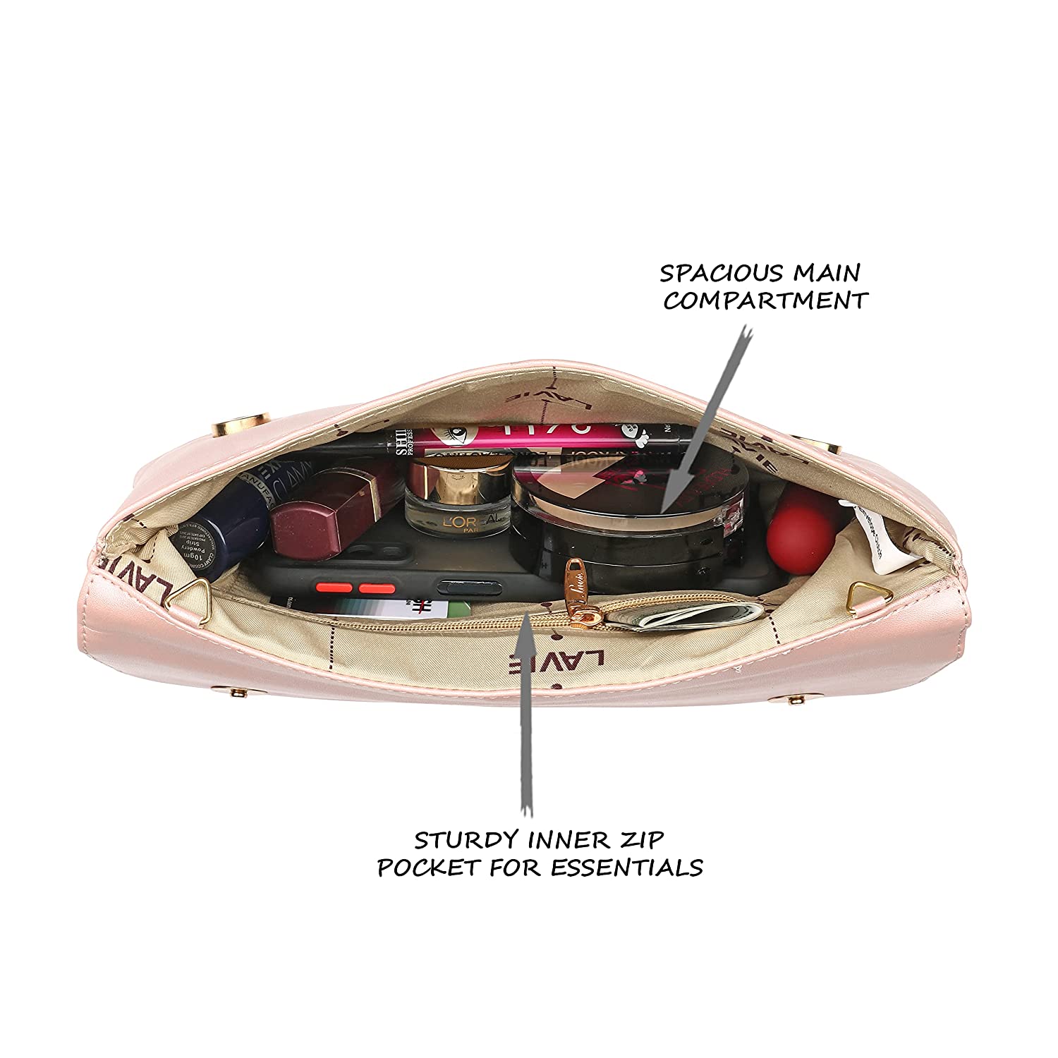 • All Lavie evening bag comes up with Lavie branded lining and clasp closure which can be opened and closed smoothly, built-in pockets,Long Shoulder detachable Metal Chain, large storage capacity which easily carries your basic essentials like a mobile phone, cards, cash, car keys, small wallet, mirror, lipstick and some makeups.
