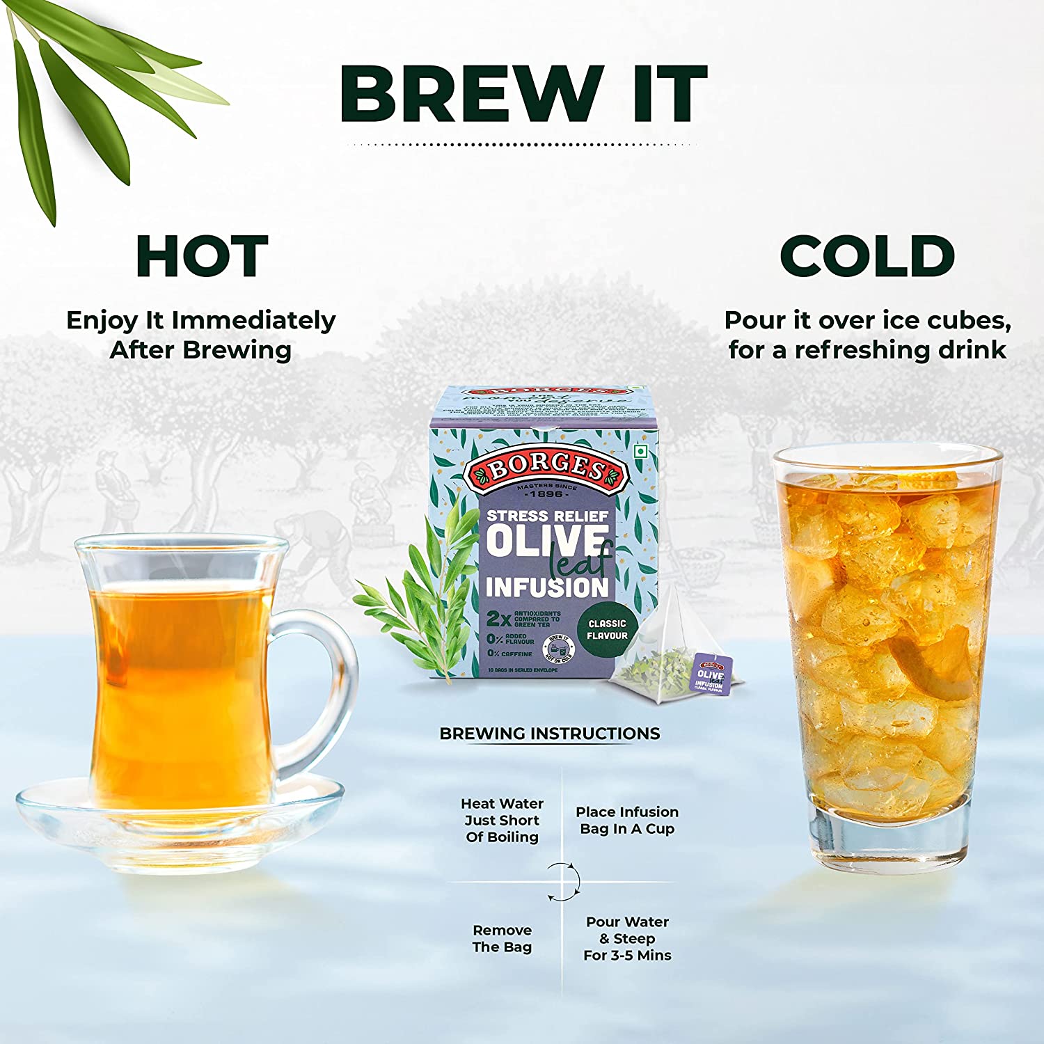 • 100?FFEINE FREE: Borges Olive Leaf Infusion is made from dried leaves of olive trees that contains twice the antioxidants compared to green tea without any presence of caffeine in it.