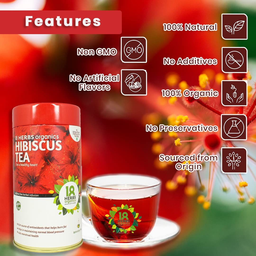 • 18 herbs organic Indian hibiscus tea is an herbal infusion made from 100% pure dried, vibrantly colored calyces or sepals of the flower. In ayurveda, hibiscus extract is used for swelling, loss of appetite, nervous disorders, heart disorders, pain in the upper respiratory tract and stomach pain.