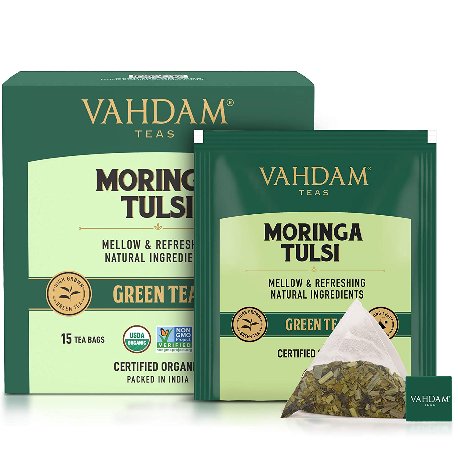 • BENEFITS OF MORINGA TULSI GREEN TEA - Reduces Stress, supports the immune system. Abundant in antioxidants, it helps builds stamina and is a natural energy booster. A powerful adaptogen.that aids digestion, is anti aging, and balances the metabolism.