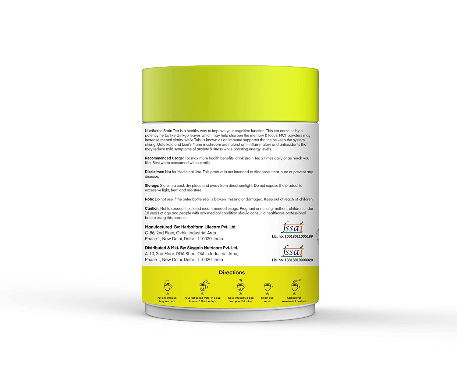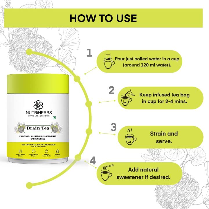 • Nutriherbs Brain Tea for men & women are made in India & free from chemicals and fillers. For maximum health benefits this nootropic tea should be consumed twice a day, with warm water, or as recommended by your physician. All of our ingredients, from the flavorings that give this tea a good taste, are 100% natural or organic.