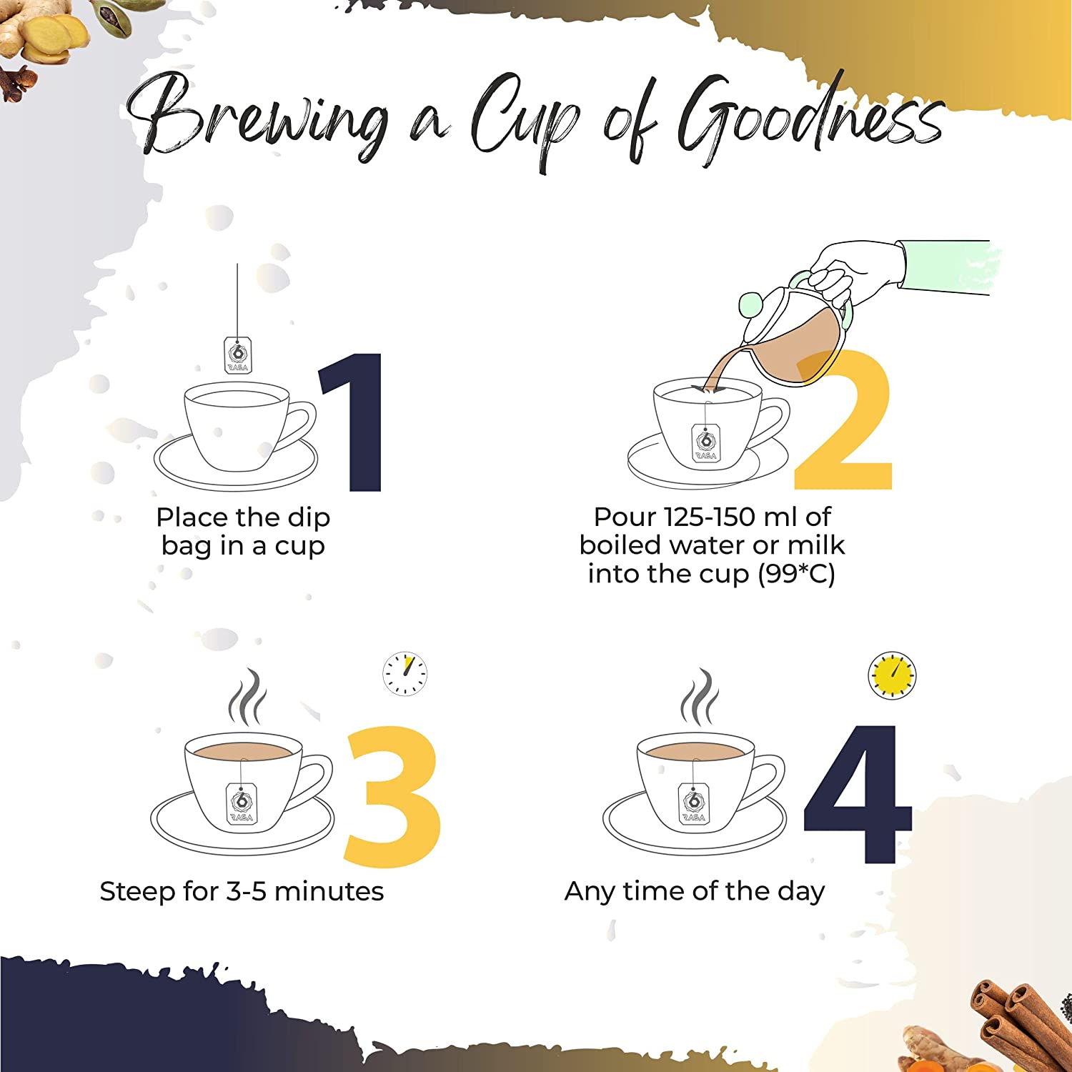 • Brewing Instructions: Place the Kashaya dip bag in a cup and pour 125 ml of BOILING HOT water or milk. Dip 10 to 15 times and Steep for 3 - 5 minutes. Sweetener not recommended when consumed with hot water. Sweetener (jaggery) optional when consumed with hot milk.