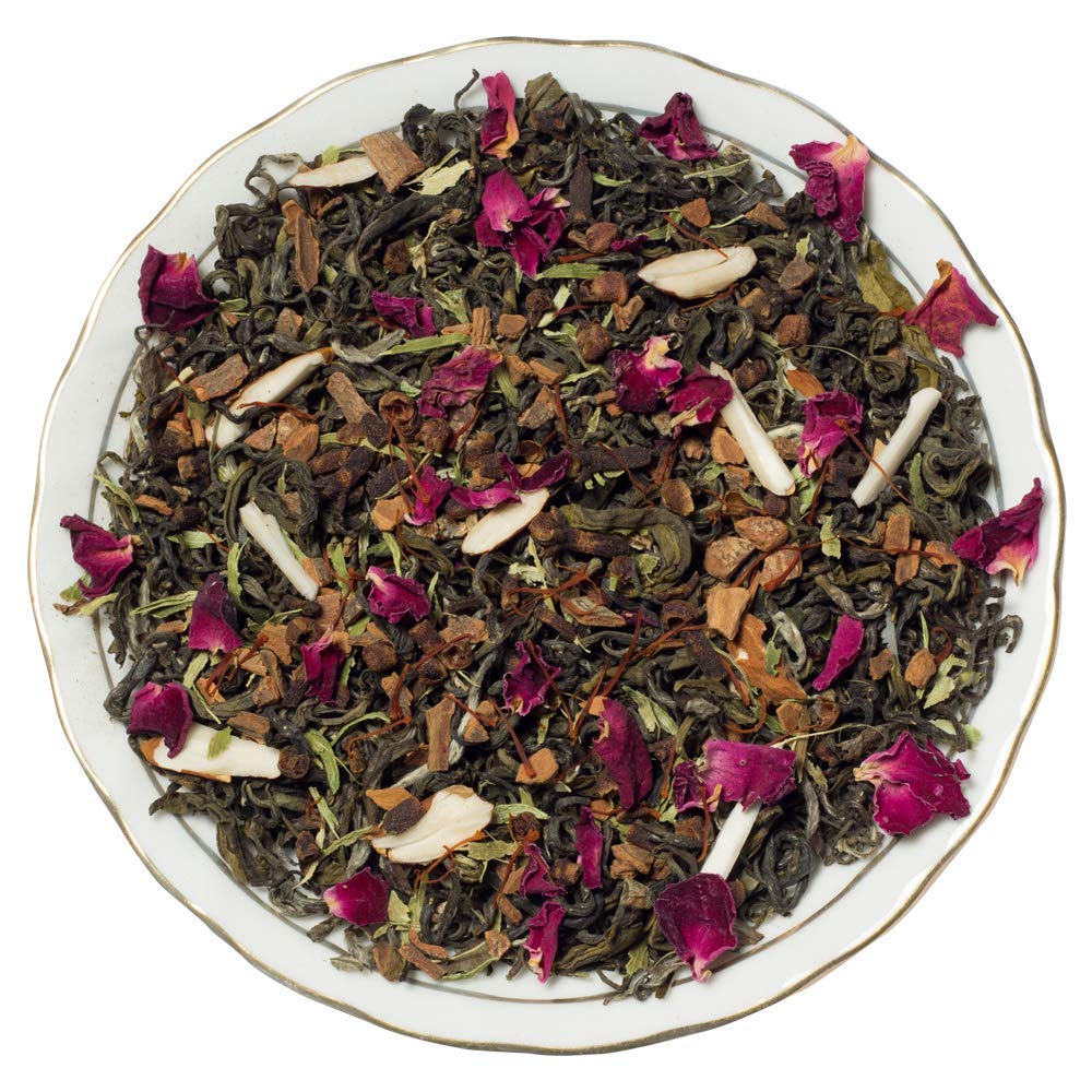 • ABOUT THE TEA: A perfect infusion of Darjeeling green tea, almonds, cinnamon, cloves, cardamom, saffron, and rose petals. Enjoy the lifted aroma of saffron and sweet spices with every cup. Savory and woody notes play with your senses, revealing a clove note that lingers on.