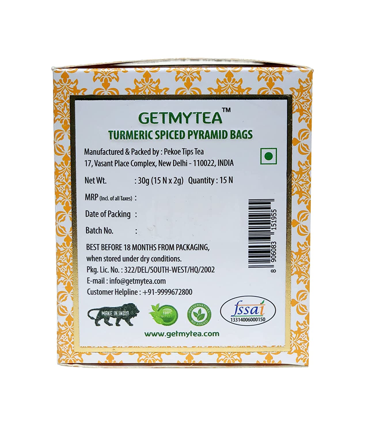 • INGREDIENTS: Blended to perfection, Getmytea Turmeric Infusion Pyramid bags contains Turmeric and Ginger sourced from Meghalaya in the North East and Lemongrass, Cinnamon Black Pepper, Lemon Peel and Cardamom brought fresh from Kerala. The blend aids digestion and boosts immunity