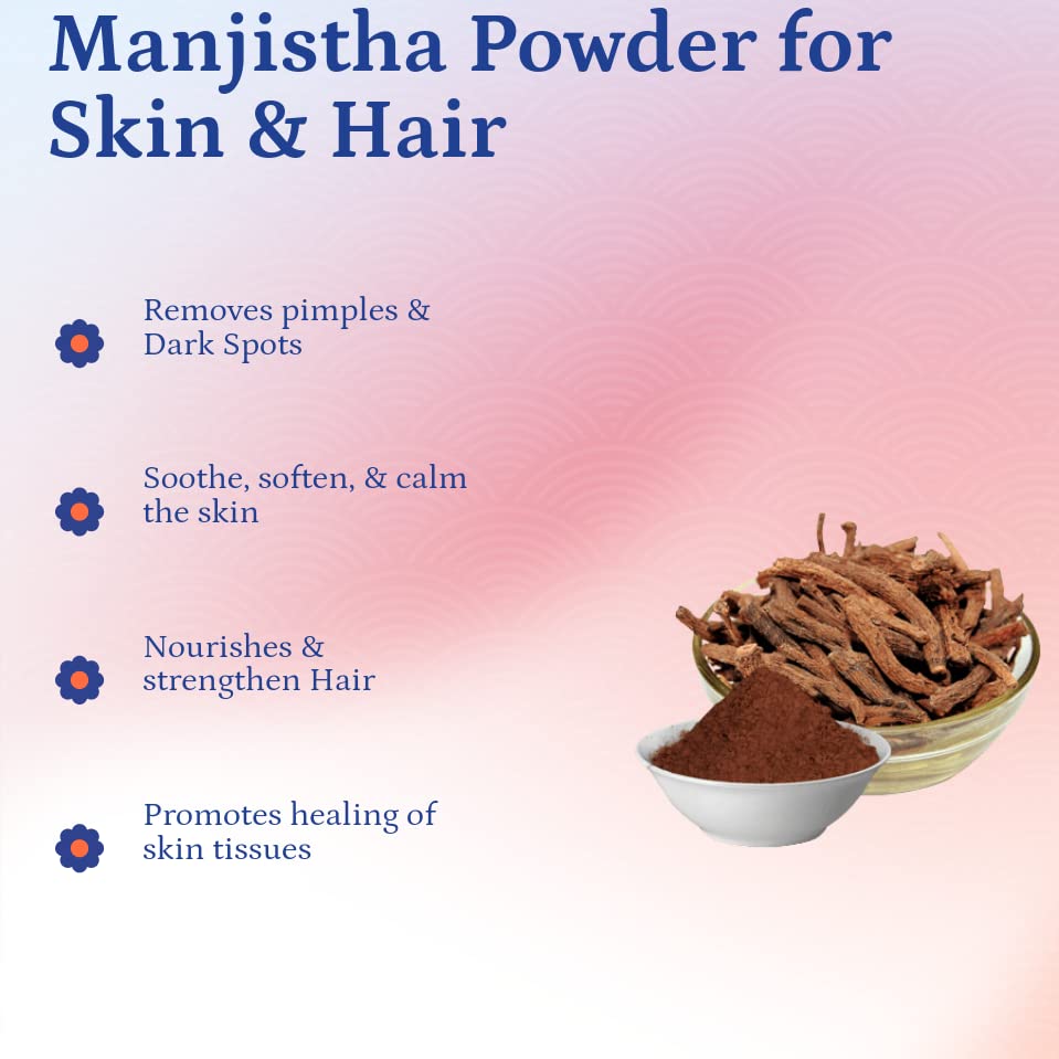 • Moisturizing effect: Manjistha powder can help moisturize the skin and prevent dryness, which can be beneficial for people with dry or sensitive skin.