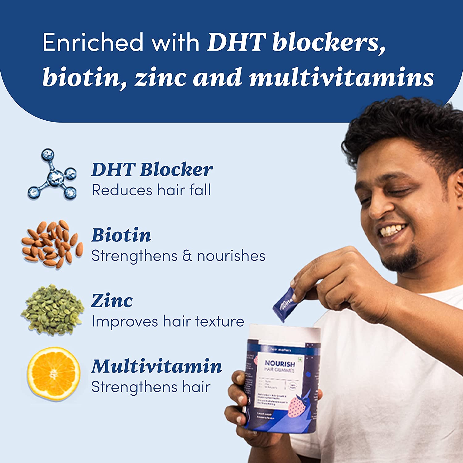 • HELPING MEN LIVE CONFIDENTLY: We understand one of the leading causes of hair fall and hair loss is a lack of proper nutrition, especially for vegetarians. We have specially designed a Gummy with all the right nutrients for healthy hair for men and are with you in your mission to live confidently.