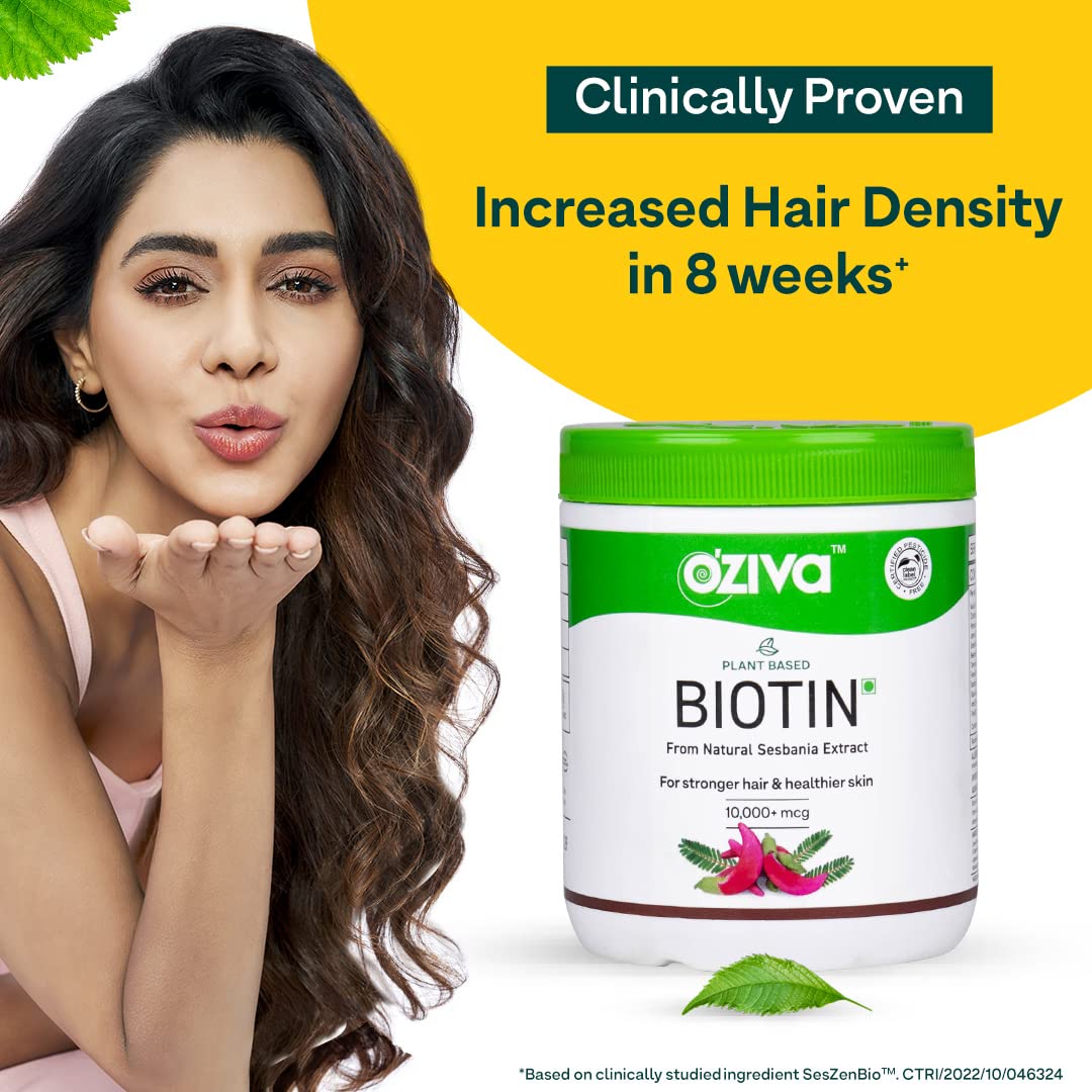 • BIOTIN FOR HAIR GROWTH: OZiva Plant Based Biotin for hair contains 10000 mcg of 100% natural Biotin derived from Sesbania Agati extracts. The proprietary blend of SesZenBio in this Biotin helps stimulate hair follicles up to 2 times to support hair growth and strengthen hair for longer and healthier hair from the inside-out.