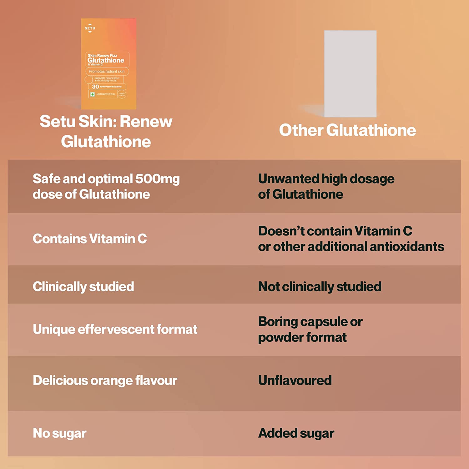 • How it's better than other brands:Contains a safe and optimal 500 mg dose of L-Glutathione, causing no unwanted side-effects. High-absorption, clinically-studied formula with no added sugar. Comes in an orange-flavoured effervescent format.