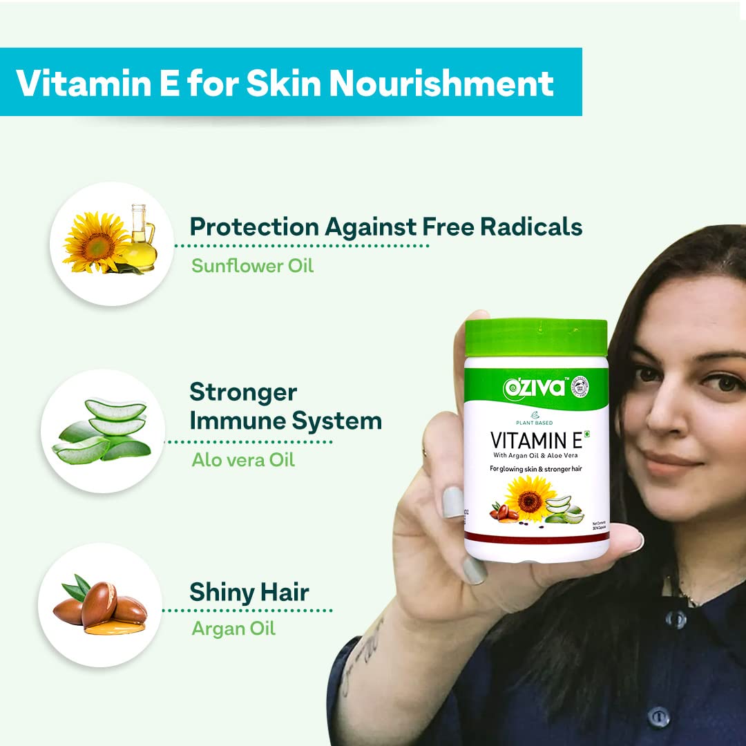 • HAR TARAH SE BETTER WITH CLEAN & PLANT-BASED VITAMIN E CAPSULES: OZiva Plant Based Vitamin E are soy-free and gluten-free vitamin e capsules for face and hair that contain no added sugar or artificial sweeteners, making them absolutely safe for long term consumption. It is 100% plant-based and is Certified Clean by the US CLP, tested and cleared for over 300 contaminants. It is also Certified Vegan by the Vegan Society of UK.