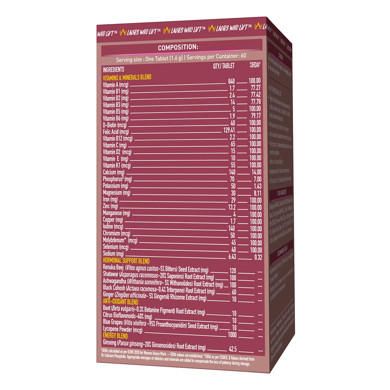 • VITAMINS AND MINERALS BLEND: Women indulging in any kind of workout have high nutrition requirements. Whether it is strength training, lifting, running, or any other exercise that requires high activity levels, every micro-nutrient matters. To perform with enhanced energy & stamina, you need STRONGHER multivitamin as the comprehensive multivitamin tablet that offers you as many as 26 vitamins & minerals daily, including 100% of the RDA for Vitamin A, B5, B12, K1, Zinc, Manganese, Iron, & more