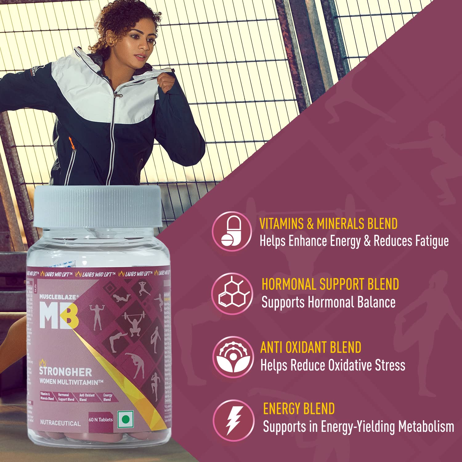 • POWER-PACKED MULTIVITAMIN FOR WOMEN: MuscleBlaze STRONGHER Women Multivitamin is a supplement designed to help women optimize their performance by covering their nutritional gaps. MB STRONGHER has been formulated with 4 different blends which contain as many as 26 vitamins and minerals