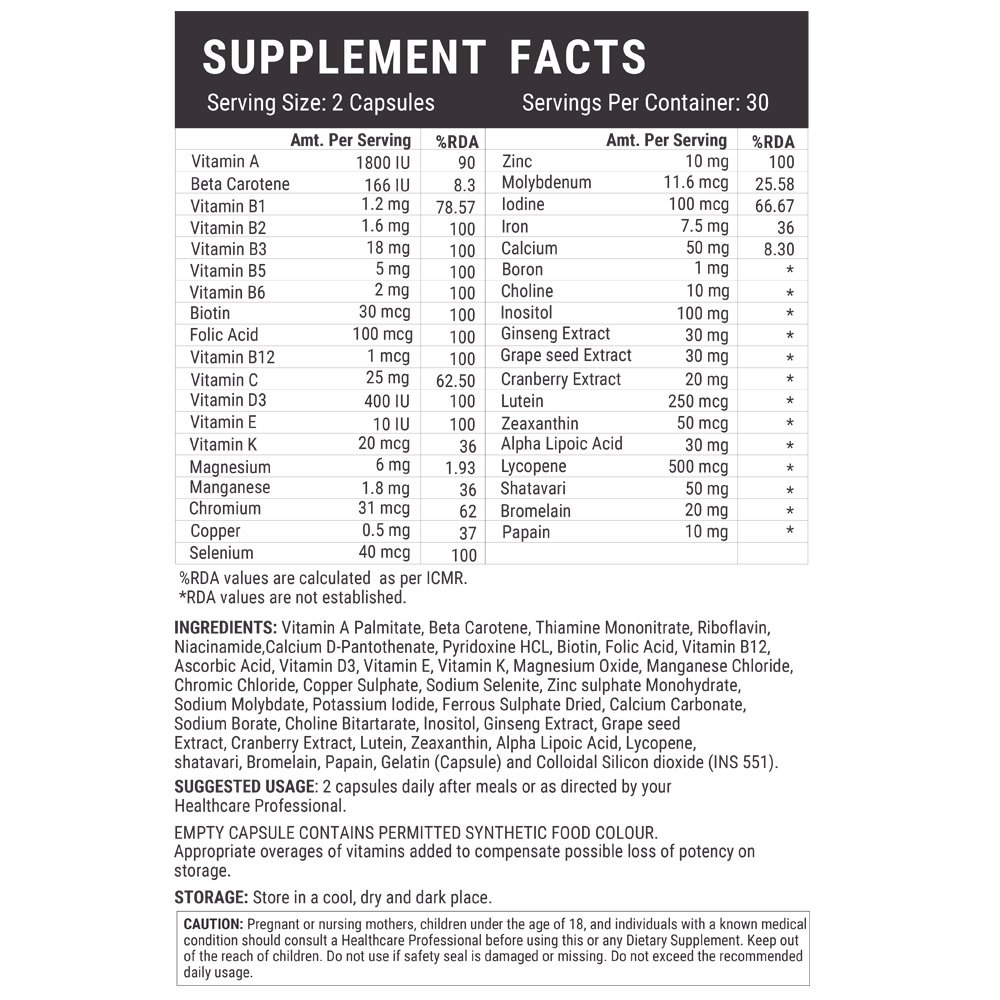 - Contains 24 essential vitamins & minerals with natural extracts of Ginseng, Grape Seed, Cranberry and Shatavari. Apart from this speciality ingredients it also contains Lutein, Zeaxanthin,Lycopene