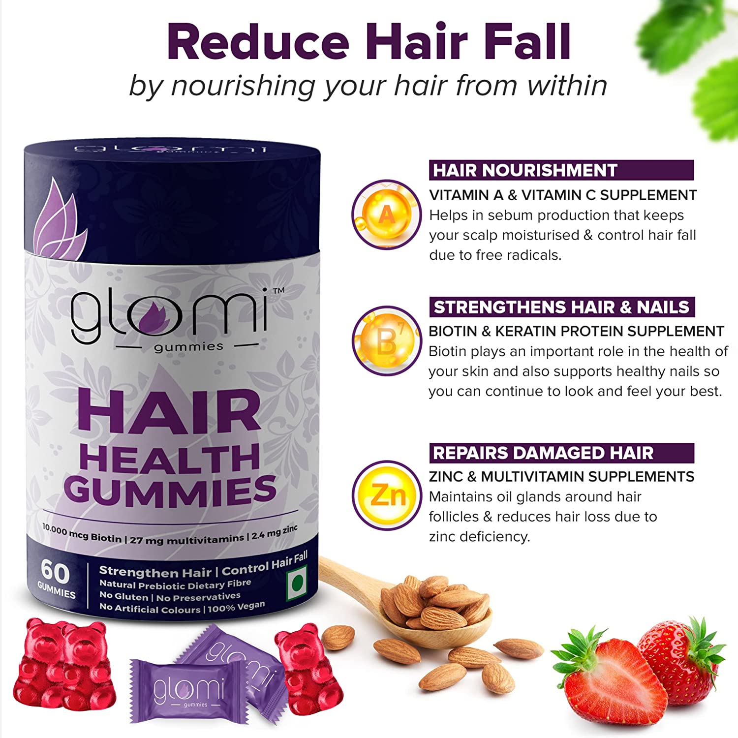 • ✅ PREMIUM QUALITY: Glomi Hair Health Gummies for women and men with natural hair growth. Upgrade to our premium biotin gummies to reduce hairfall and nourish hair. Formulated to support hair growth and reduce breakage. Convenient and delicious way to supplement, gluten-free, cruelty-free and non-GMO, 100% Vegan, Sugar-Free.