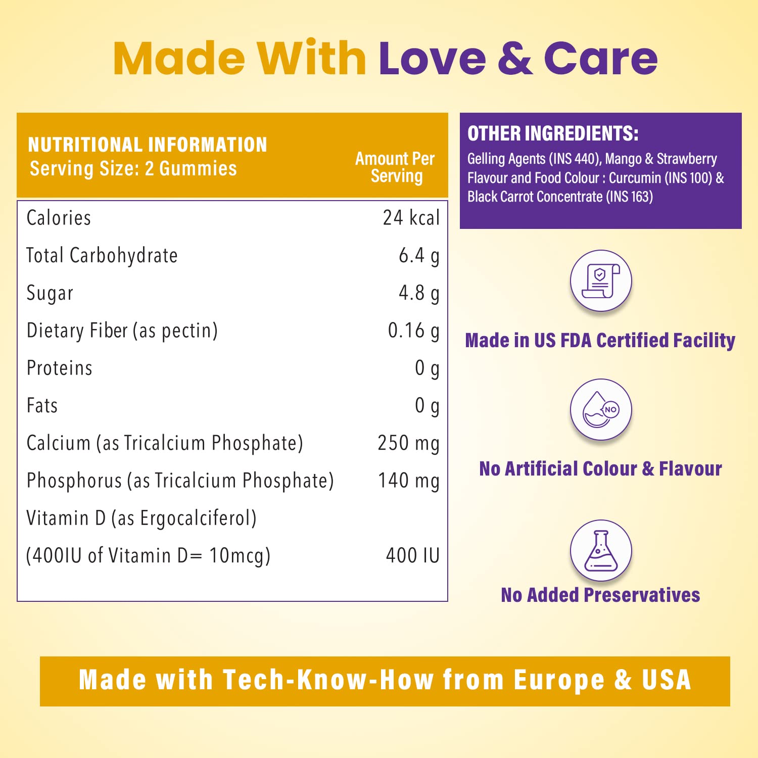 • 100% GOODNESS, ZERO JUNK: Our calcium and Vitamin-D gummies are manufactured in an FSSAI-approved, USFDA Registered, WHO-GMP &HACCP certified facility. We strive to bring you clean and natural ingredient formulations that are vegetarian and contain only natural colours. These are also GMO-Free, Gluten-Free, Gelatin-Free and Lactose-Free with no added preservatives