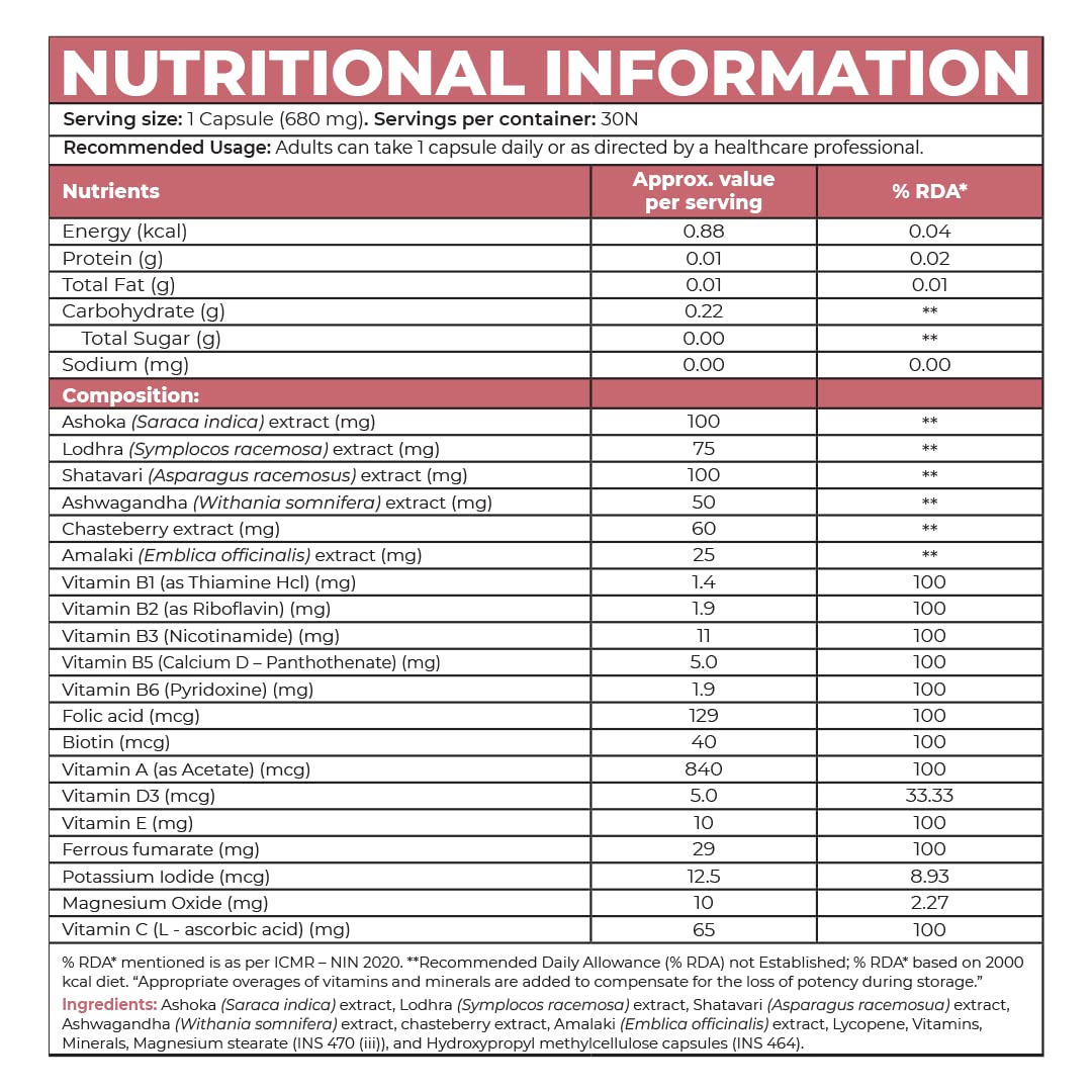| Special Ingredients | Ashoka Extract & Chasteberry, Ashwagandha, Vitamin B complex, Calcium, Iron & Magnesium, |